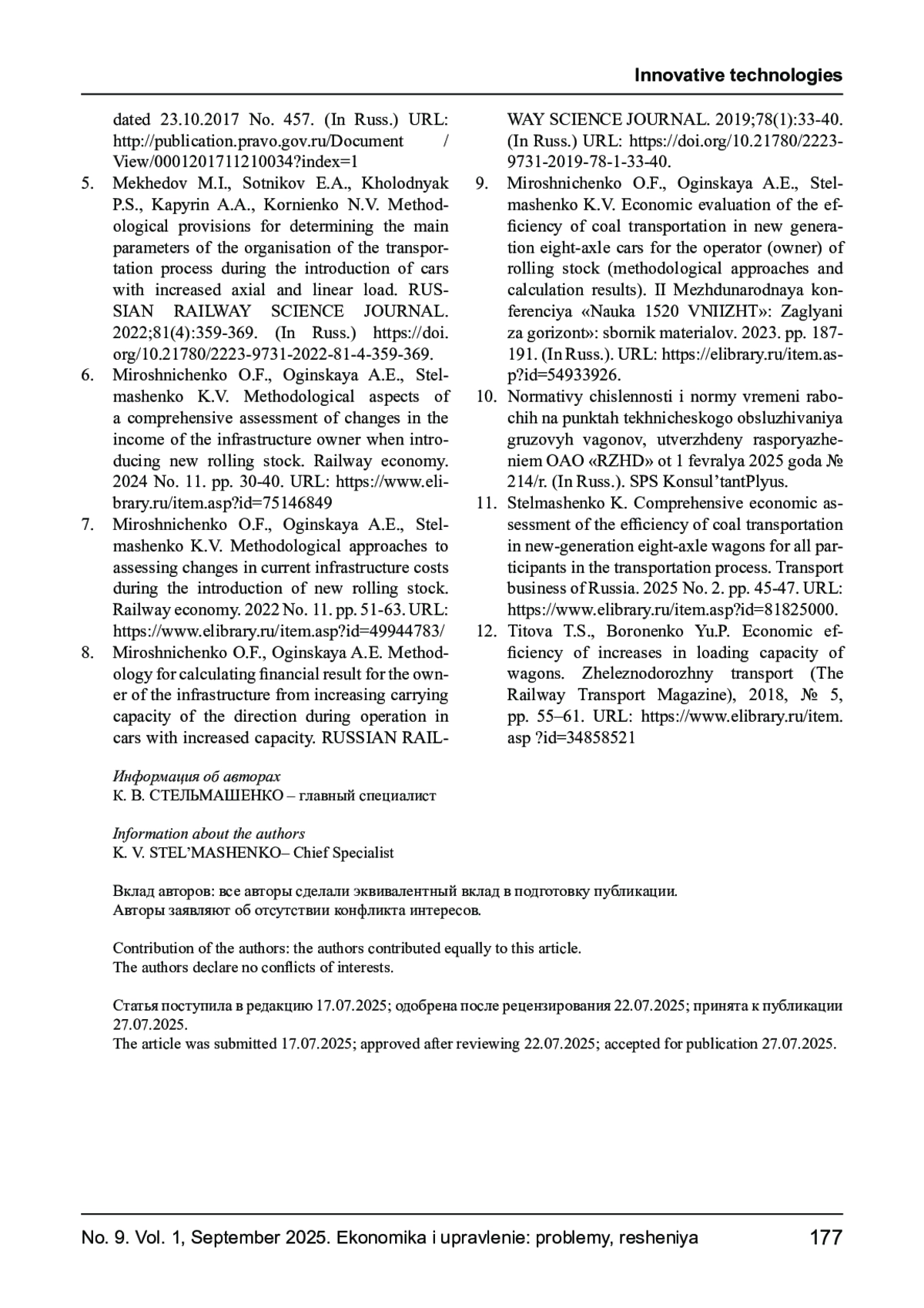 9. Мирошниченко, О. Ф. Экономическая оценка эффективности перевозок угля в восьмиосных вагонах нового поколения для оператора (владельца) подвижного состава (методические подходы и результаты расчета) [Электронный ресурс] / О. Ф. Мирошниченко, А. Е. Огинская, К. В. Стельмашенко // II Международная конференция “Наука 1520 ВНИИЖТ”: Загляни зa горизонт“: Сборник материалов конференции, Москва, 24-25 августа 2023 года. - Москва: АО “Научно-исследовательский институт железнодорожного транспорта”, 2023. - С. 187-191. - Режим доступа: item.asp?id=54933926 (дата обращения: 04.08.2025). EDN: ZFRJOC