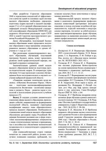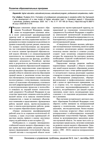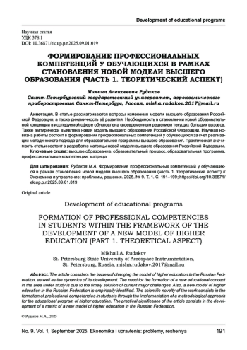 РУДАКОВ М. А. ФОРМИРОВАНИЕ ПРОФЕССИОНАЛЬНЫХ КОМПЕТЕНЦИЙ У ОБУЧАЮЩИХСЯ В РАМКАХ СТАНОВЛЕНИЯ НОВОЙ МОДЕЛИ ВЫСШЕГО ОБРАЗОВАНИЯ (ЧАСТЬ 1. ТЕОРЕТИЧЕСКИЙ АСПЕКТ) // ЭКОНОМИКА И УПРАВЛЕНИЕ: ПРОБЛЕМЫ, РЕШЕНИЯ. 2025. ТОМ 1 № 9
