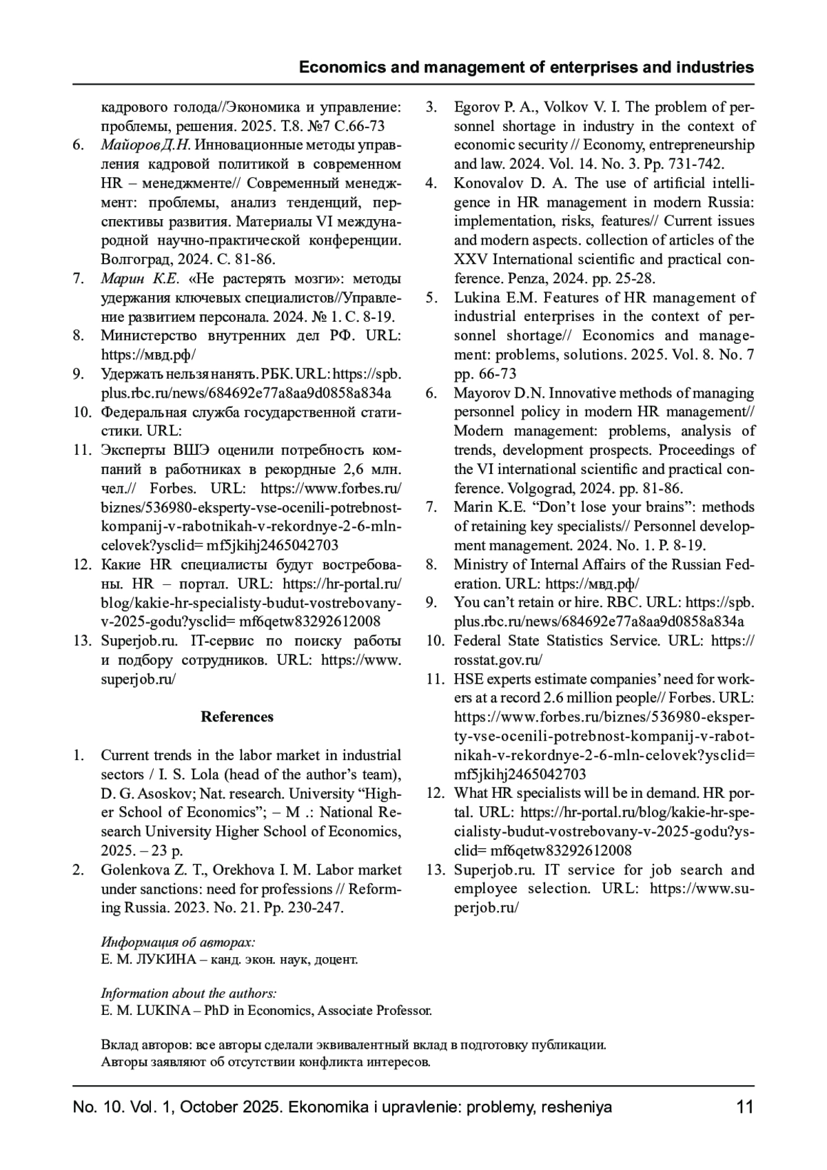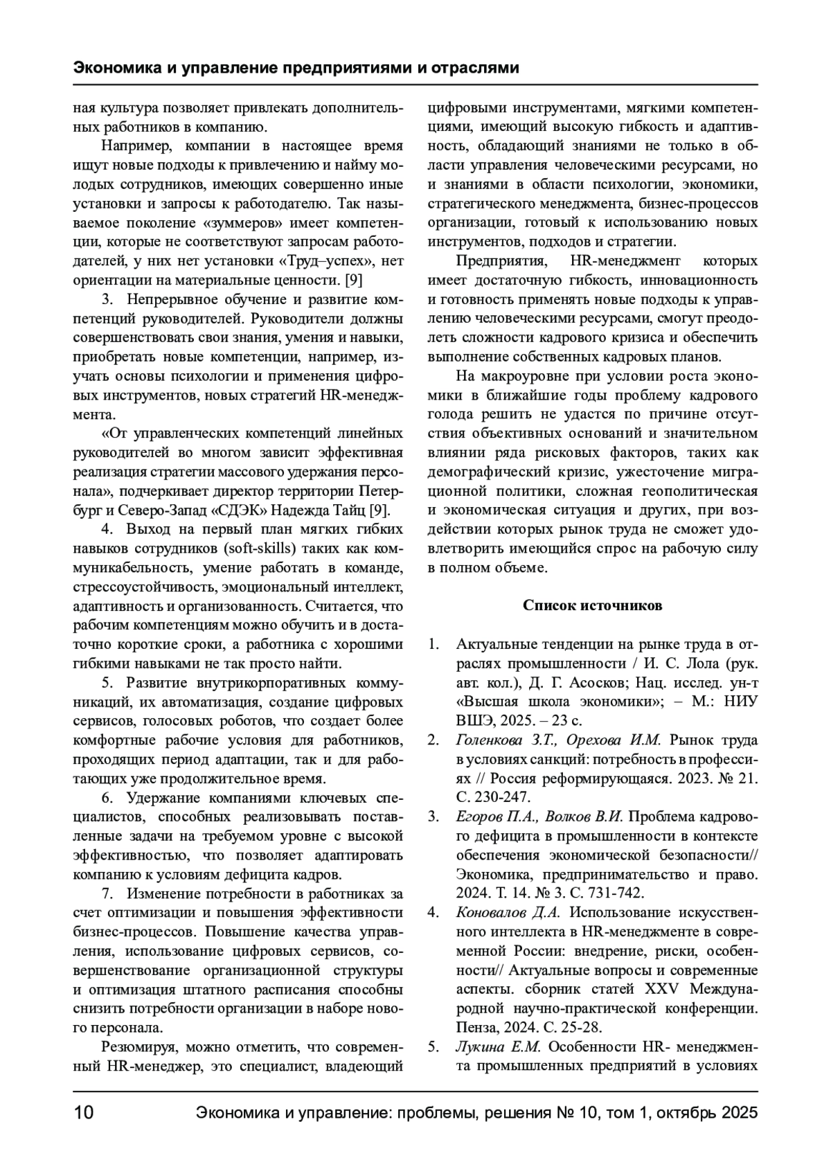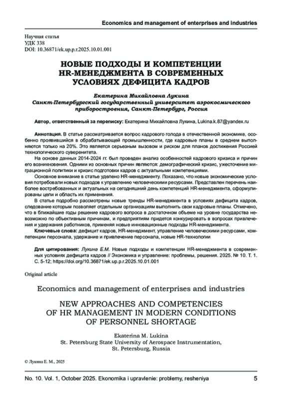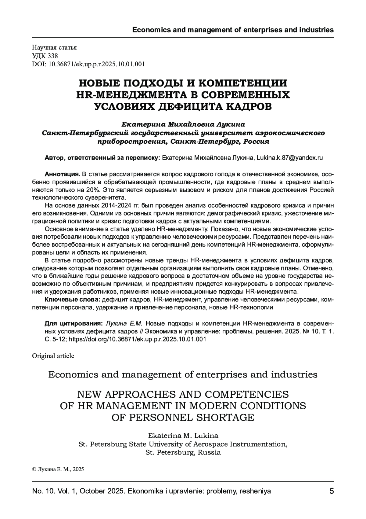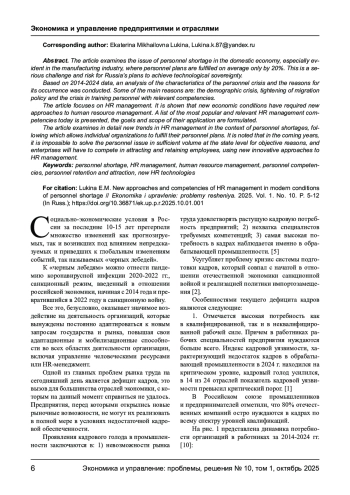 ЛУКИНА Е. М. НОВЫЕ ПОДХОДЫ И КОМПЕТЕНЦИИ HR-МЕНЕДЖМЕНТА В СОВРЕМЕННЫХ УСЛОВИЯХ ДЕФИЦИТА КАДРОВ // ЭКОНОМИКА И УПРАВЛЕНИЕ: ПРОБЛЕМЫ, РЕШЕНИЯ. 2025. ТОМ 1 № 10