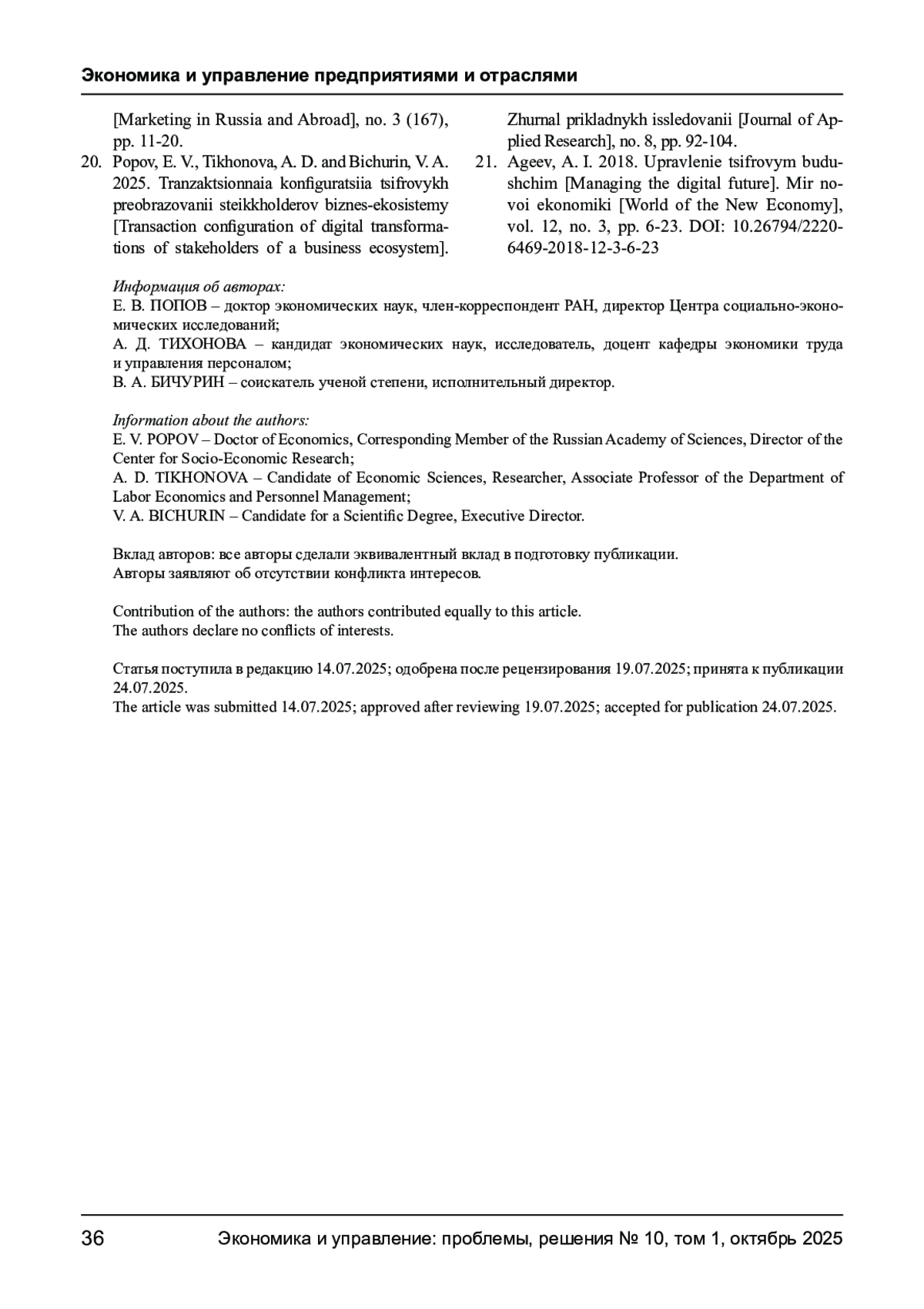 20. Попов Е. В., Тихонова А. Д., Бичурин В. А. Трансакционная конфигурация цифровых преобразований стейкхолдеров бизнес-экосистемы // Журнал прикладных исследований. - 2025. - № 8. - С. 92-104. EDN: IBUEON