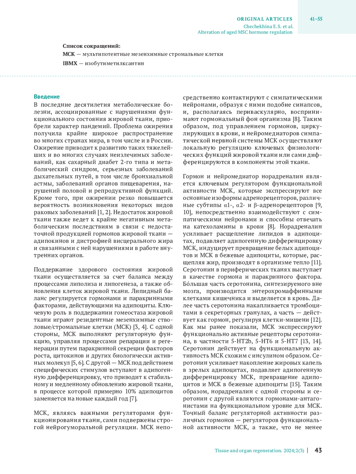 В данной работе мы исследовали изменения гормональной регуляции стволовых клеток жировой ткани человека при старении и то, как эти изменения ассоциированы с адипогенной дифференцировкой этих клеток. В качестве объекта изучения гормональной регуляции использовали постнатальные стволовые клетки жировой ткани — мультипотентные мезенхимные стромальные клетки (МСК). Мы показали, что как МСК с индуцированным репликативным старением, так и МСК, полученные от пожилых доноров, обладают сниженным адипогенным потенциалом, также у этих клеток нарушены механизмы регуляции адипогенной дифференцировки при действии норадреналина и серотонина. Изучение внутриклеточных сигнальных каскадов позволило установить, что при старении в МСК проявляется пониженная активация как цАМФ-зависимых, так и фосфоинозитид/ кальций-зависимых сигнальных каскадов. Кальциевые ответы на стимуляцию норадреналином и серотонином оказались отложенными во времени в МСК с индуцированным репликативным старением. Таким образом, старение приводит к снижению регуляторного воздействия гормонов-регуляторов на адипогенную дифференцировку МСК человека.