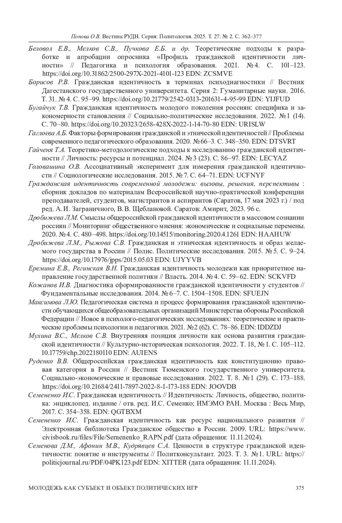 16. Семененко И.С. Гражданская идентичность // Идентичность: Личность, общество, политика: энциклопед. издание / отв. ред. И.С. Семенко; ИМЭМО РАН. Москва: Весь Мир, 2017. С. 354-358. EDN: QGTBXM