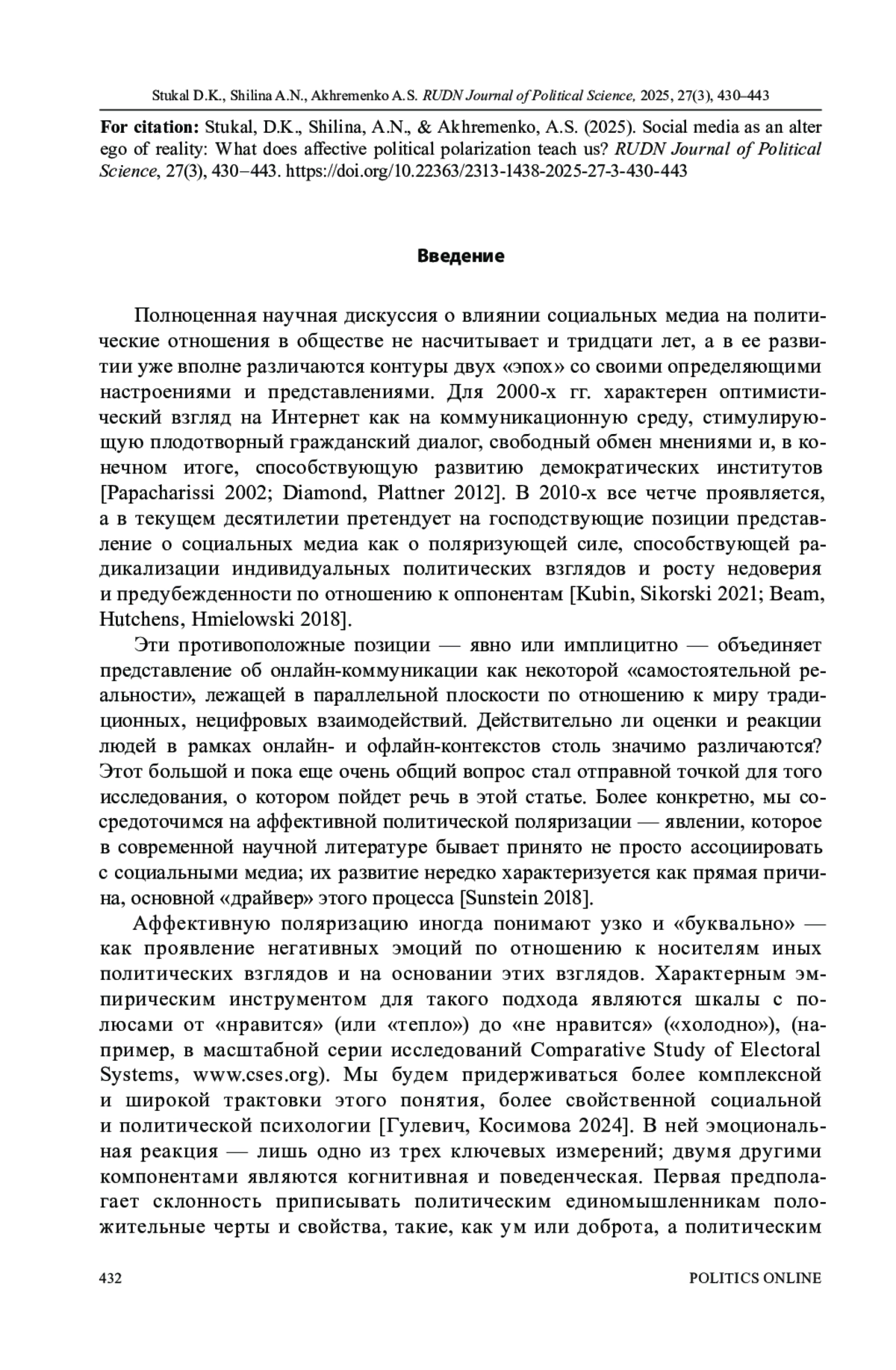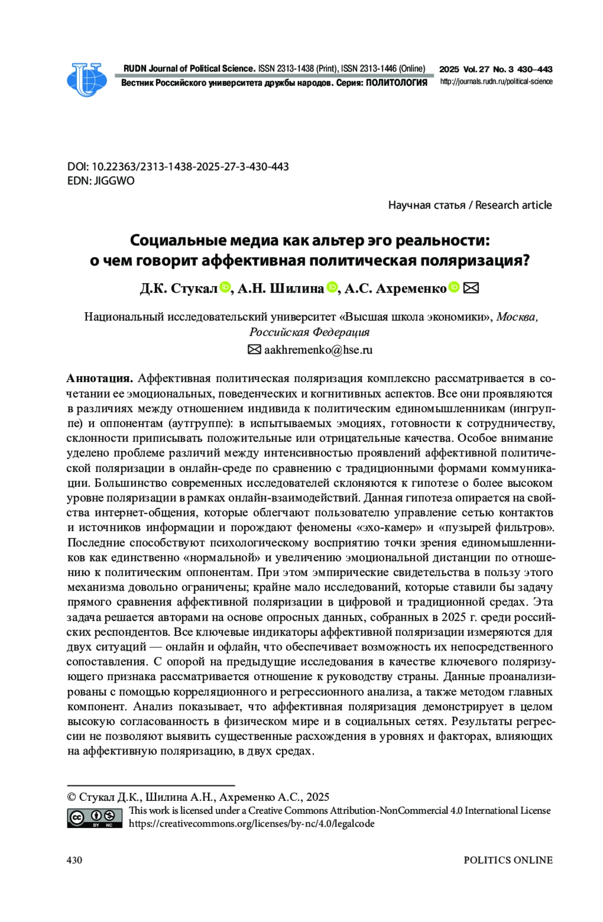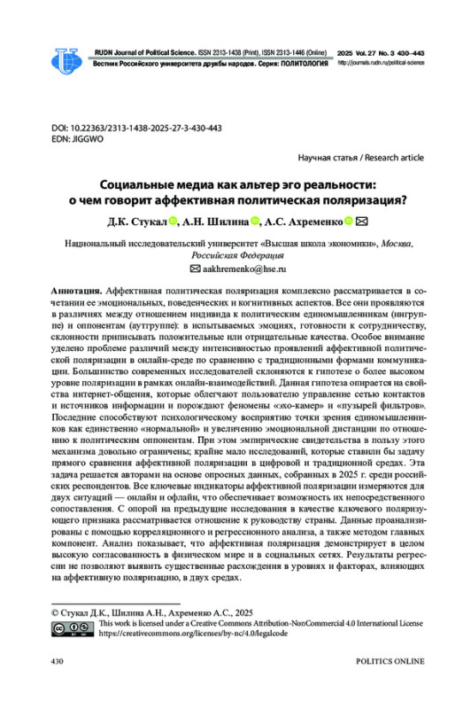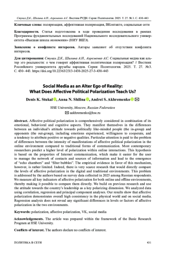 СТУКАЛ Д. К., ШИЛИНА А. Н., АХРЕМЕНКО А. С. СОЦИАЛЬНЫЕ МЕДИА КАК АЛЬТЕР ЭГО РЕАЛЬНОСТИ: О ЧЕМ ГОВОРИТ АФФЕКТИВНАЯ ПОЛИТИЧЕСКАЯ ПОЛЯРИЗАЦИЯ? // ВЕСТНИК РОССИЙСКОГО УНИВЕРСИТЕТА ДРУЖБЫ НАРОДОВ. СЕРИЯ: ПОЛИТОЛОГИЯ. 2025. Т. 27 № 3