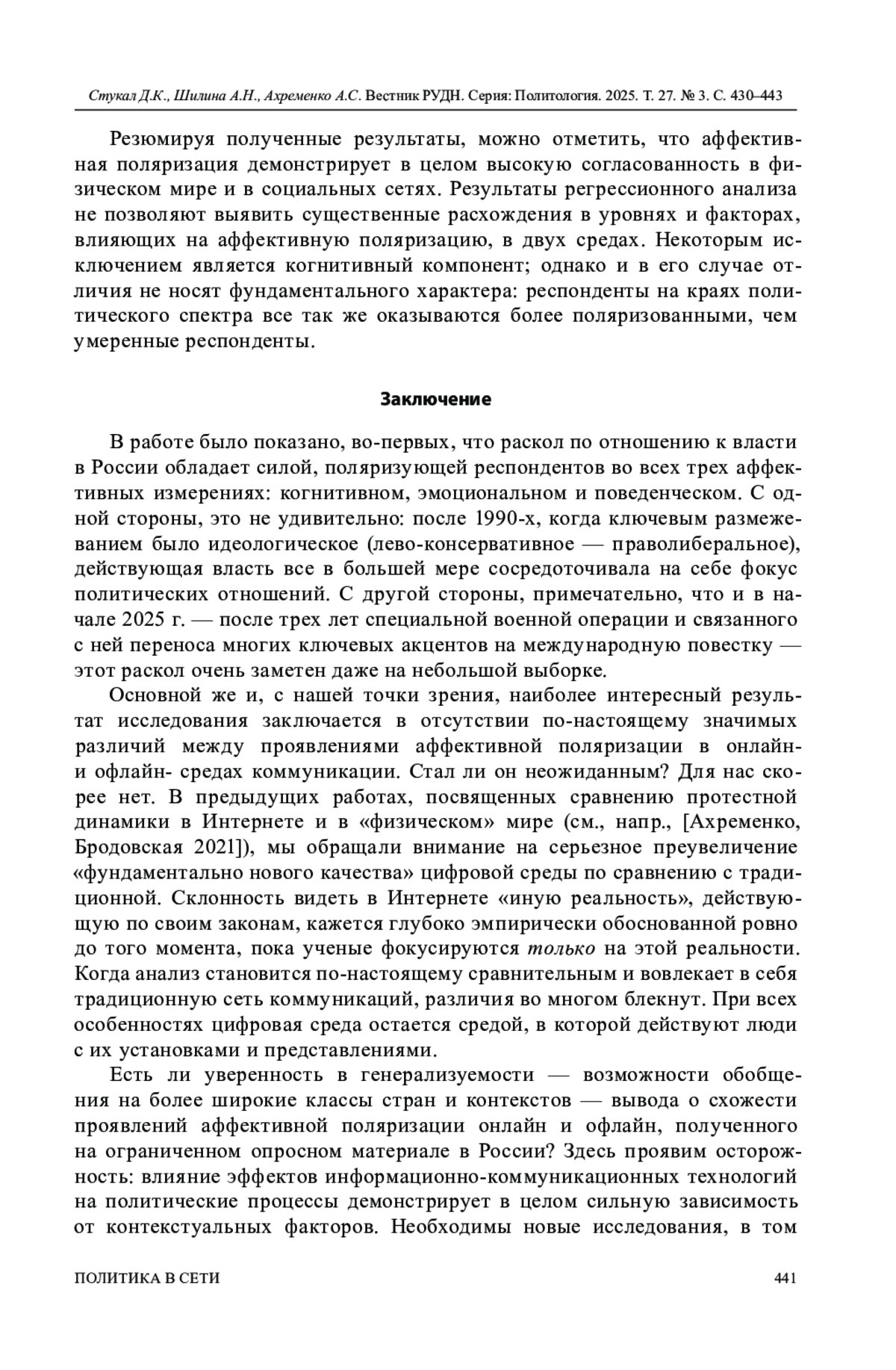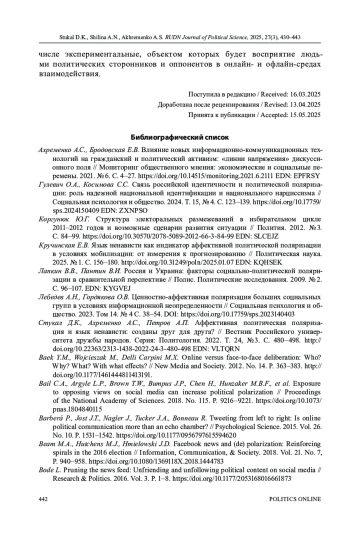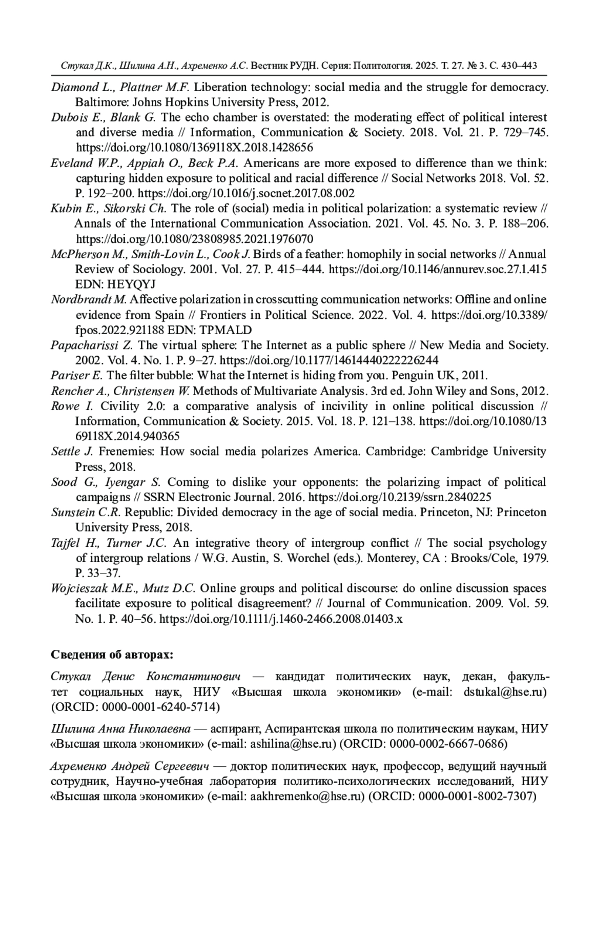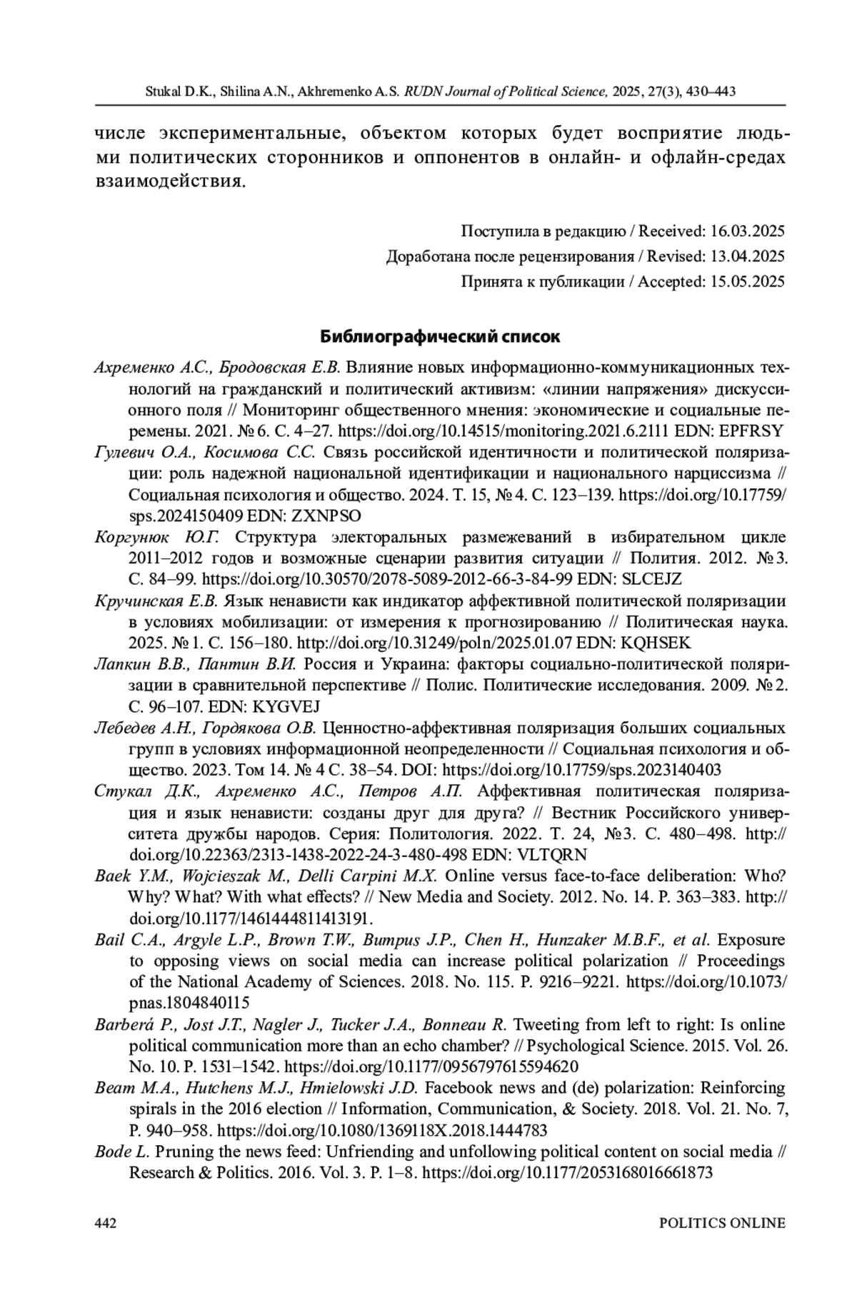 СТУКАЛ Д. К., ШИЛИНА А. Н., АХРЕМЕНКО А. С. СОЦИАЛЬНЫЕ МЕДИА КАК АЛЬТЕР ЭГО РЕАЛЬНОСТИ: О ЧЕМ ГОВОРИТ АФФЕКТИВНАЯ ПОЛИТИЧЕСКАЯ ПОЛЯРИЗАЦИЯ? // ВЕСТНИК РОССИЙСКОГО УНИВЕРСИТЕТА ДРУЖБЫ НАРОДОВ. СЕРИЯ: ПОЛИТОЛОГИЯ. 2025. Т. 27 № 3