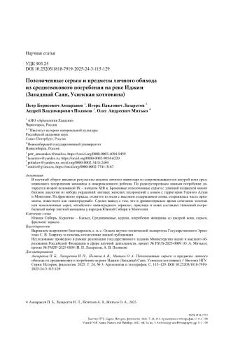 В научный оборот вводятся результаты анализа личного инвентаря из сопровождавшегося шкурой коня средневекового захоронения женщины и новорожденного ребенка. По радиоуглеродным данным погребение датируется второй половиной IX – началом XIII в. Бронзовые позолоченные серьги с длинной подвеской имеют близкие аналогии из набора украшений элитных женских захоронений с конем с территории Горного Алтая и Монголии. На фрагменте зеркала, отлитого из меди с высоким содержанием олова, сохранилась часть орнамента, известного как «виноградный». Сделан вывод о том, что в древнетюркское время сочетание золотых или позолоченных серег, китайского «виноградного зеркала», пряслица и ножа составлял типичный погребальный набор знатной женщины у народов Южной Сибири и Монголии.