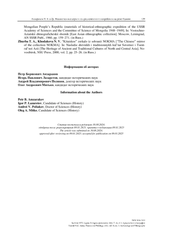 16. Журба Т. А., Ходакова Н. В. «Китайское» зеркало из собраний НОКМА // Наследие древних и традиционных культур Северной и Центральной Азии. Новосибирск: Изд-во НГУ, 2000. Т. 2. С. 25-26.