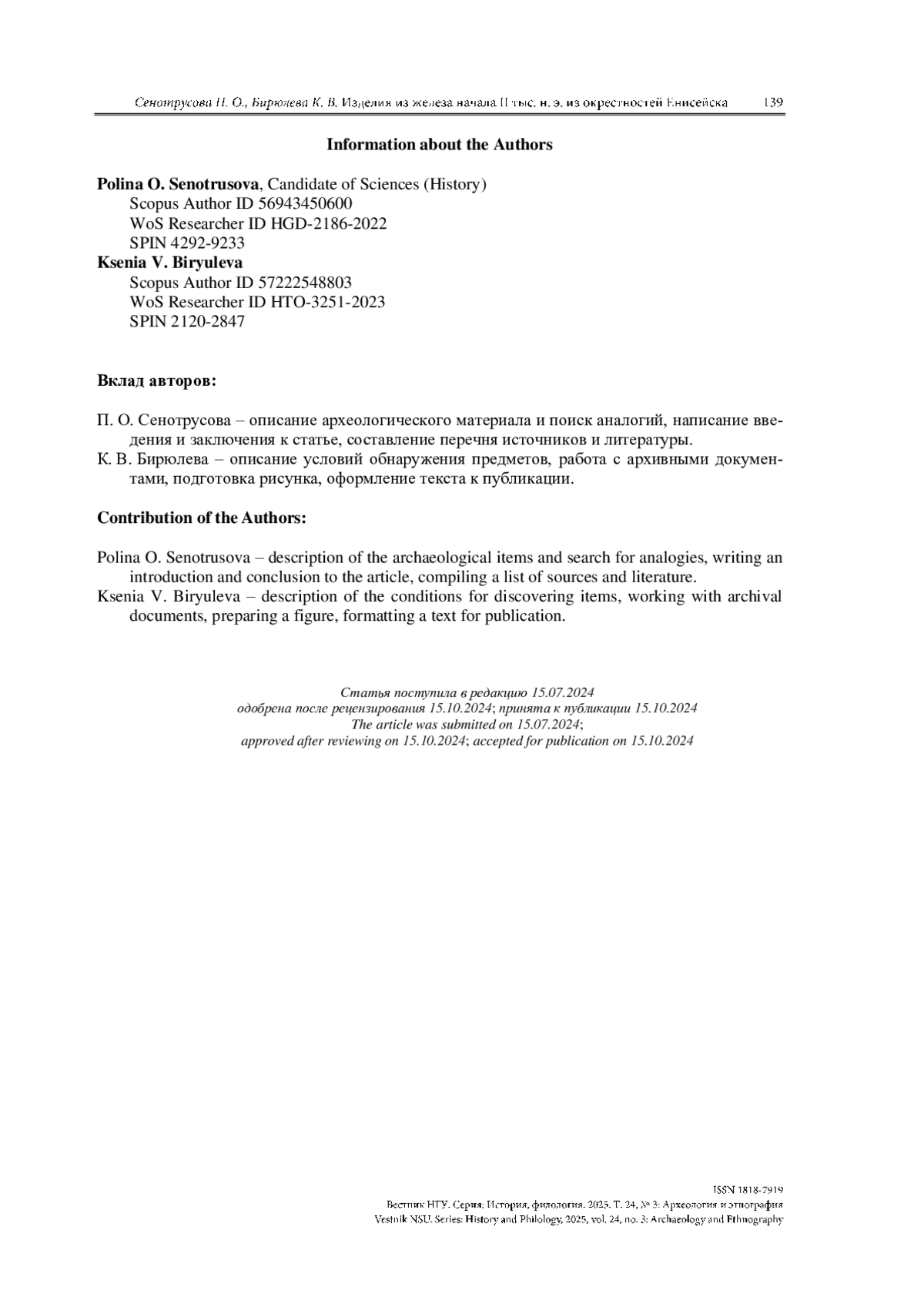 10. Мандрыка П. В., Сенотрусова П. О. Культурная принадлежность памятников развитого Средневековья южнотаежной зоны Средней Сибири // РА. 2018. № 2. С. 98-112.