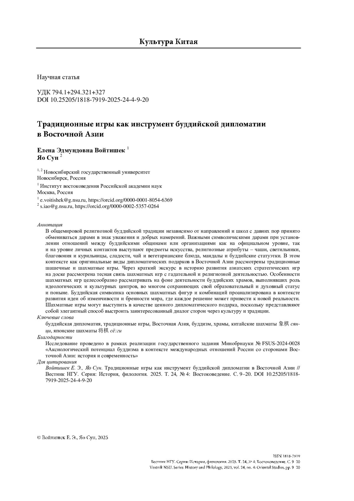 В общемировой религиозной буддийской традиции независимо от направлений и школ с давних пор принято обмениваться дарами в знак уважения и добрых намерений. Важными символическими дарами при установлении отношений между буддийскими общинами или организациями как на официальном уровне, так и на уровне личных контактов выступают предметы искусства, религиозные атрибуты – чаши, светильники, благовония и курильницы, сладости, чай и вегетарианские блюда, мандалы и буддийские статуэтки. В этом контексте как оригинальные виды дипломатических подарков в Восточной Азии рассмотрены традиционные шашечные и шахматные игры. Через краткий экскурс в историю развития азиатских стратегических игр на доске рассмотрена тесная связь шахматных игр с гадательной и религиозной деятельностью. Особенности шахматных игр целесообразно рассматривать на фоне деятельности буддийских храмов, выполнявших роль идеологических и культурных центров, во многом сохраняющих свой образовательный и духовный статус и поныне. Буддийская символика основных шахматных фигур и комбинаций проанализирована в контексте развития идеи об изменчивости и бренности мира, где каждое решение может привести к новой реальности. Шахматные игры могут выступить в качестве ценного дипломатического подарка, поскольку представляяют собой элегантный способ выстроить заинтересованный диалог сторон через культуру и традиции.