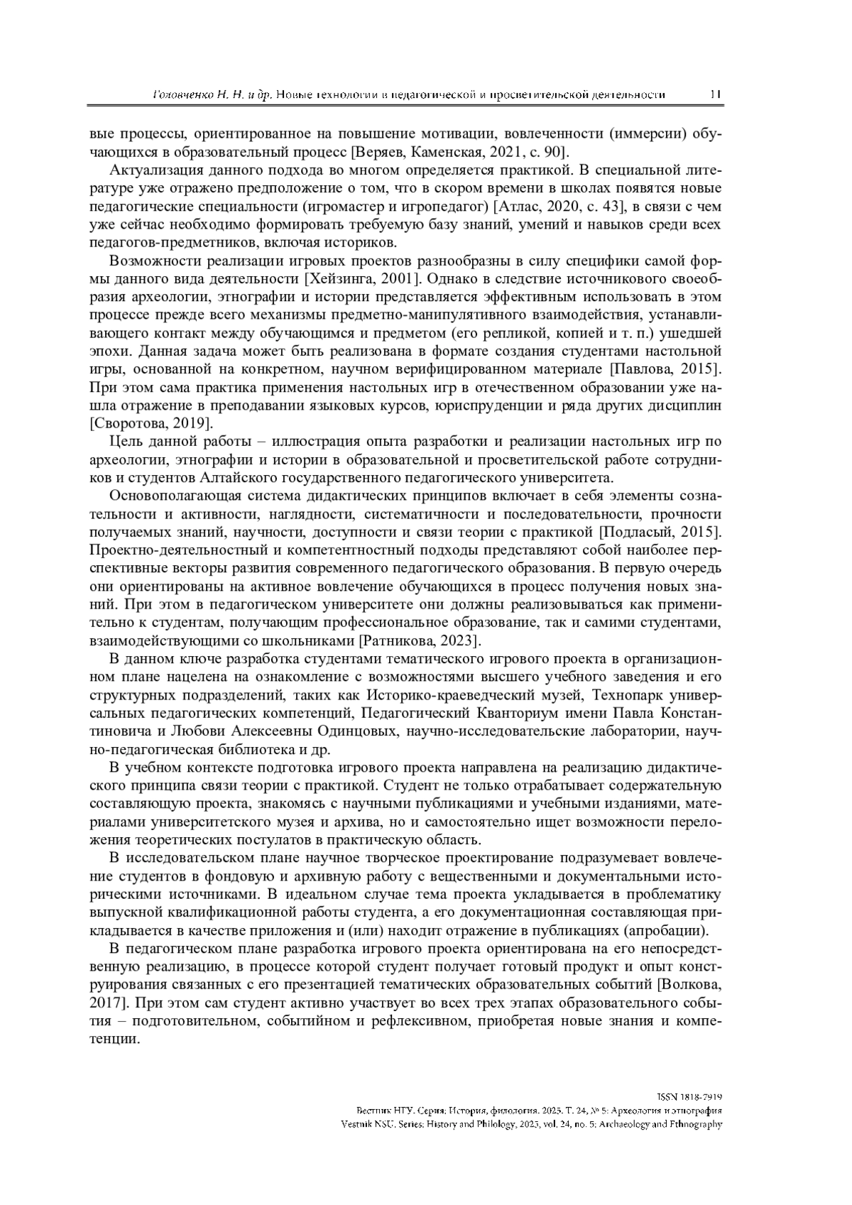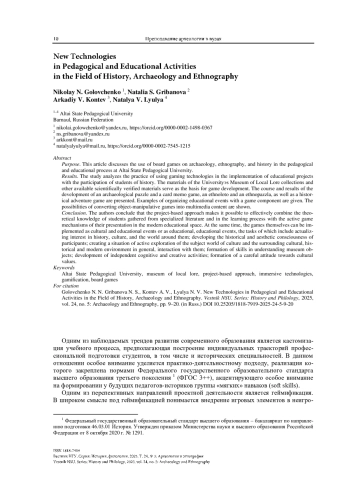 6. Головченко Н. Н., Грибанова Н. С., Вайцель Д. Э. Опыт разработки археологического мультимедийного контента для студентов педагогических университетов // Вестник НГУ. Серия: История, филология. 2023. Т. 22, № 5: Археология и этнография. С. 9-19. https://doi.org/10.25205/1818-7919-2023-22-5-9-19