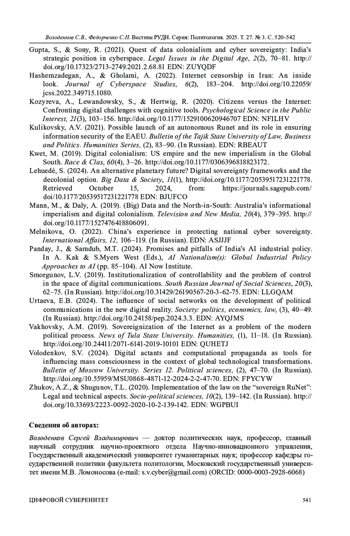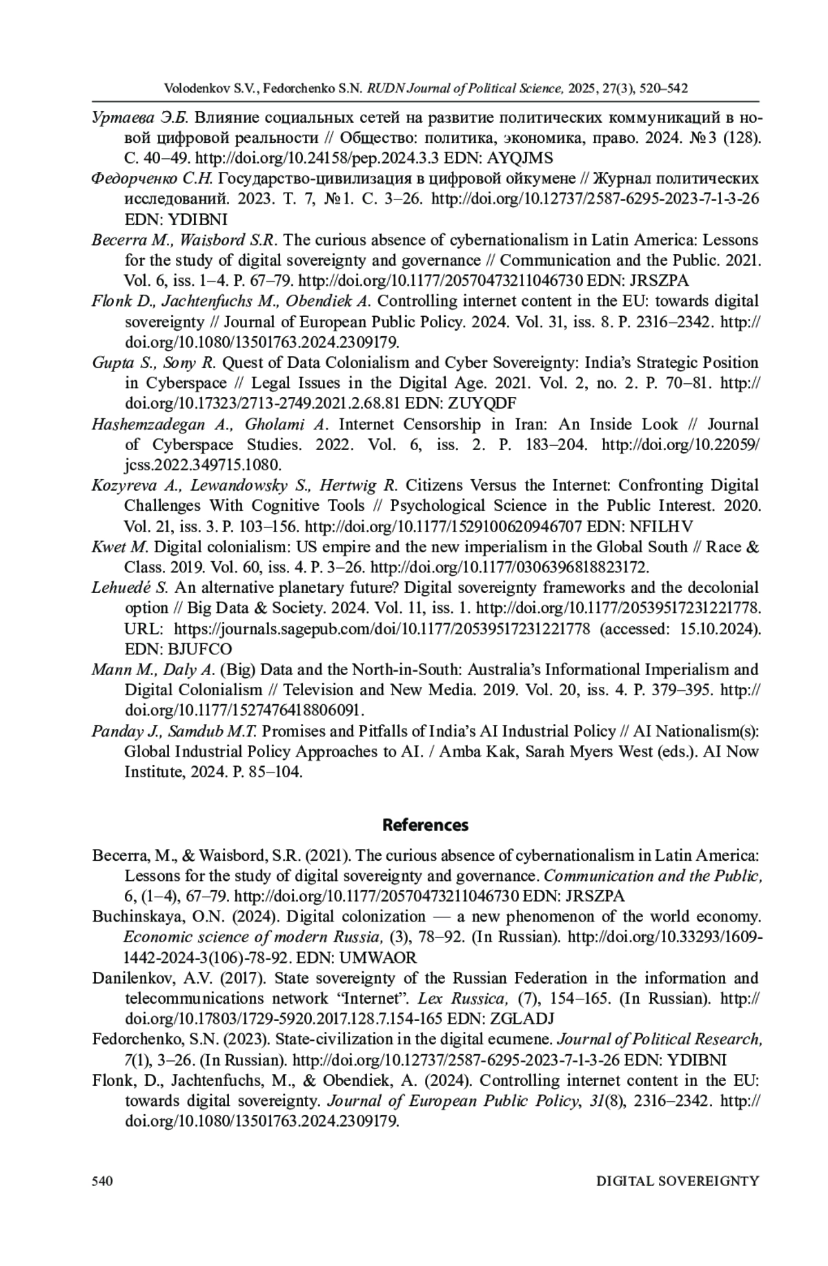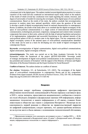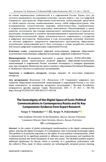 ВОЛОДЕНКОВ С. В., ФЕДОРЧЕНКО С. Н. СУВЕРЕНИТЕТ ЦИФРОВОГО ПРОСТРАНСТВА ОБЩЕСТВЕННО-ПОЛИТИЧЕСКИХ КОММУНИКАЦИЙ В СОВРЕМЕННОЙ РОССИИ И ЕГО КЛЮЧЕВЫЕ КОМПОНЕНТЫ: ПО МАТЕРИАЛАМ ЭКСПЕРТНОГО ИССЛЕДОВАНИЯ // ВЕСТНИК РОССИЙСКОГО УНИВЕРСИТЕТА ДРУЖБЫ НАРОДОВ. СЕРИЯ: ПОЛИТОЛОГИЯ. 2025. Т. 27 № 3
