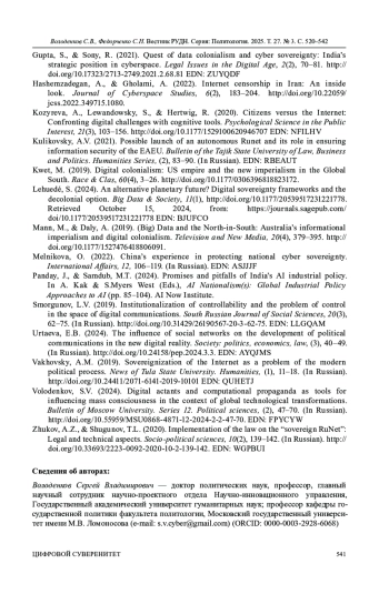 Ключевые фразы: суверенизация цифровой коммуникации, цифровые общественно-политические коммуникации, цифровая колонизация, цифровой суверенитет россии