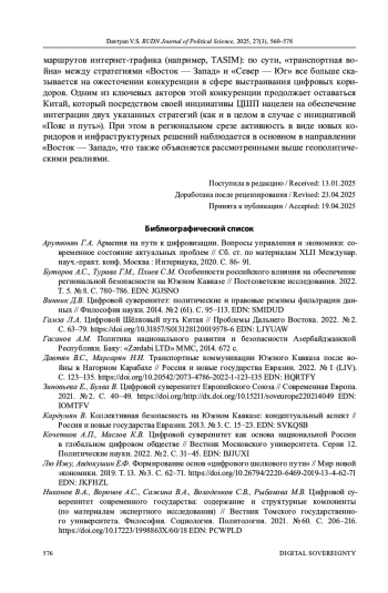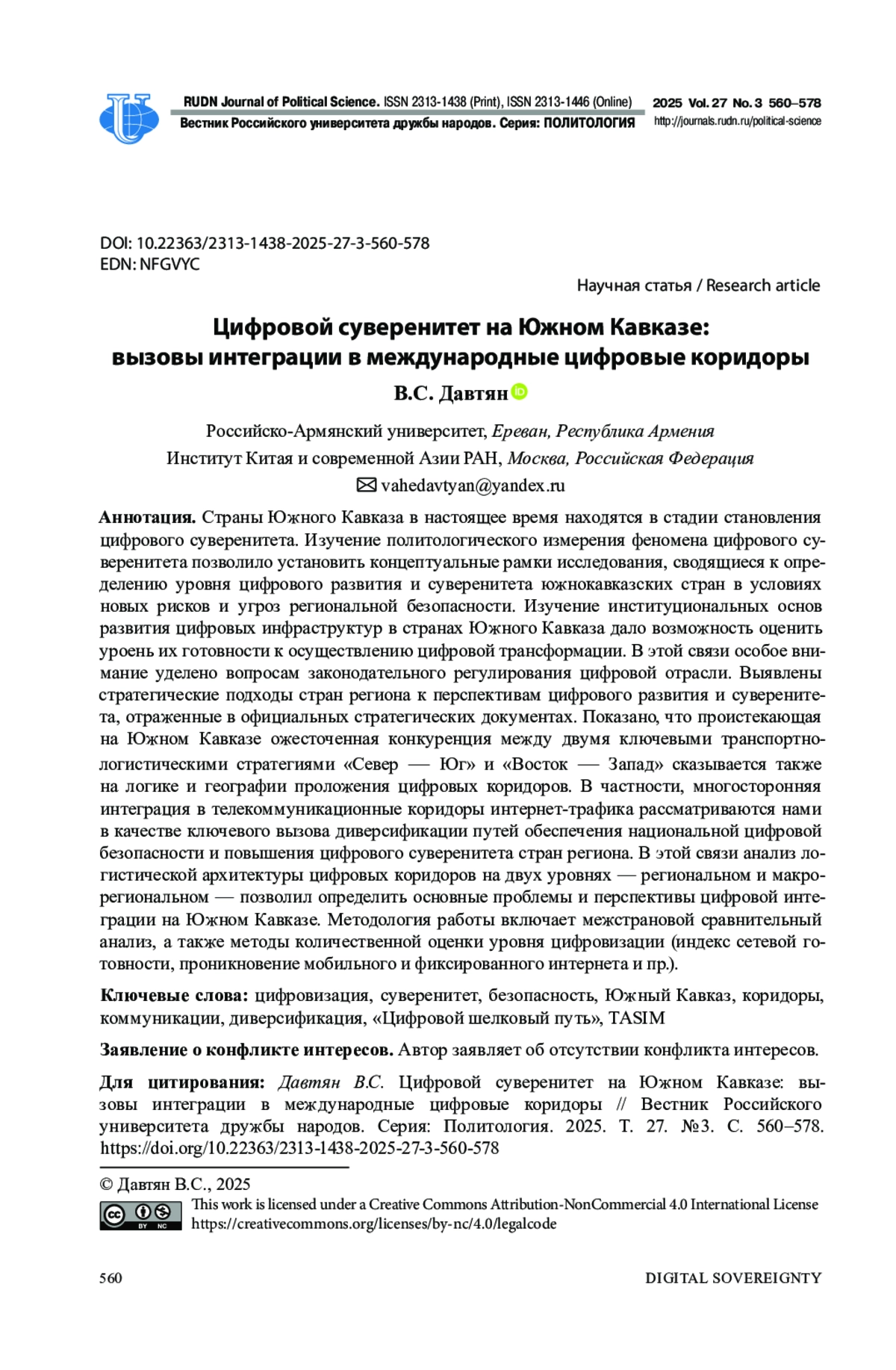 Страны Южного Кавказа в настоящее время находятся в стадии становления цифрового суверенитета. Изучение политологического измерения феномена цифрового суверенитета позволило установить концептуальные рамки исследования, сводящиеся к определению уровня цифрового развития и суверенитета южно кавказских стран в условиях новых рисков и угроз региональной безопасности. Изучение институциональных основ развития цифровых инфраструктур в странах Южного Кавказа дало возможность оценить уроень их готовности к осуществлению цифровой трансформации. В этой связи особое внимание уделено вопросам законодательного регулирования цифровой отрасли. Выявлены стратегические подходы стран региона к перспективам цифрового развития и суверенитета, отраженные в официальных стратегических документах. Показано, что проистекающая на Южном Кавказе ожесточенная конкуренция между двумя ключевыми транспортно-логистическими стратегиями «Север - Юг» и «Восток - Запад» сказывается также на логике и географии проложения цифровых коридоров. В частности, многосторонняя интеграция в телекоммуникационные коридоры интернет-трафика рассматриваются нами в качестве ключевого вызова диверсификации путей обеспечения национальной цифровой безопасности и повышения цифрового суверенитета стран региона. В этой связи анализ логистической архитектуры цифровых коридоров на двух уровнях - региональном и макрорегиональном - позволил определить основные проблемы и перспективы цифровой интеграции на Южном Кавказе. Методология работы включает межстрановой сравнительный анализ, а также методы количественной оценки уровня цифровизации (индекс сетевой готовности, проникновение мобильного и фиксированного интернета и пр.).