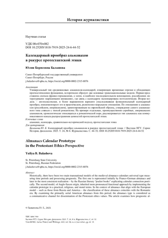 Универсальный тип средневековых альманахов-календарей, измеряющих временные отрезки и обладающих прогностическими функциями, исторически образует две основные транснациональные модели. Первая представлена сначала франко-германскими, а затем, в наиболее последовательном воплощении, российскими литературными «карманными книжками», где связь с календарем эксплицирована поэтологически. Вторая модель – англосаксонская, в более выраженном варианте унаследовавшая функциональный календарный прообраз, имплементирует его в практическом, религиозно-моральном отношении. По отношению к альманахам (российским, американским), ориентированным на европейский образец, утверждение самого альманашного типа совпало с эпохой романтизма. На примере отдельных, преимущественно серийных, американских альманахов, хронологически относящихся к романтической поре, рассматривается тип альманаха как коммуникативного канала распространения ценностей протестантской этики.