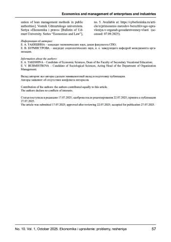 10. Чазова И. Ю., Соломенникова С. И. Применение методов бережливого управления в органах государственной власти // Вестник Удмуртского университета. Серия “Экономика и право”. - 2021. - № 5. [Электронный ресурс]. - URL: https://cyberleninka.ru/article/n/primenenie-metodov-berezhlivogo-upravleniya-v-organah-gosudarstvennoy-vlasti (дата обращения: 07.09.2025).