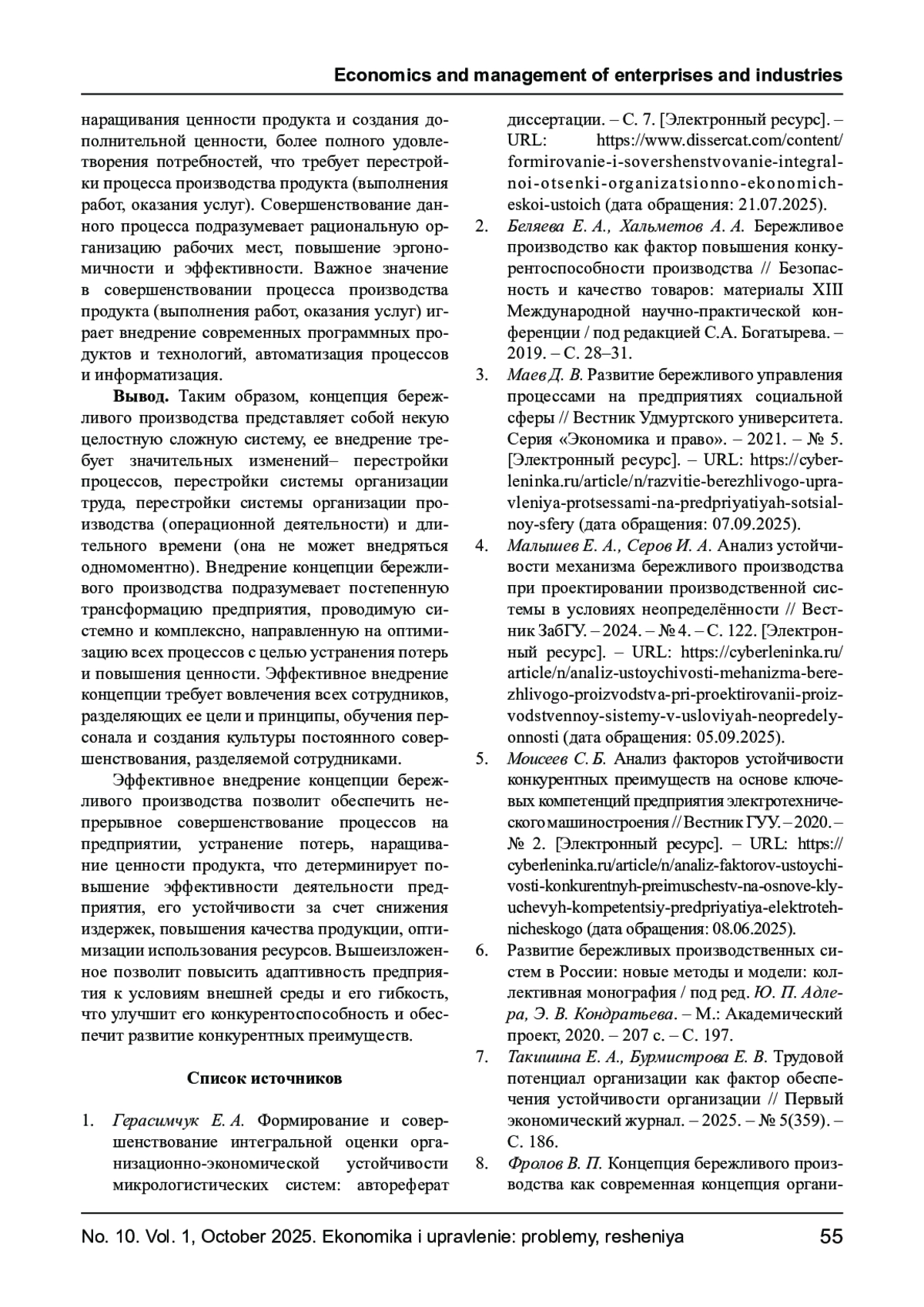 8. Фролов В. П. Концепция бережливого производства как современная концепция организации труда работников предприятия // Вестник евразийской науки. - 2022. - № 2. - С. 32.