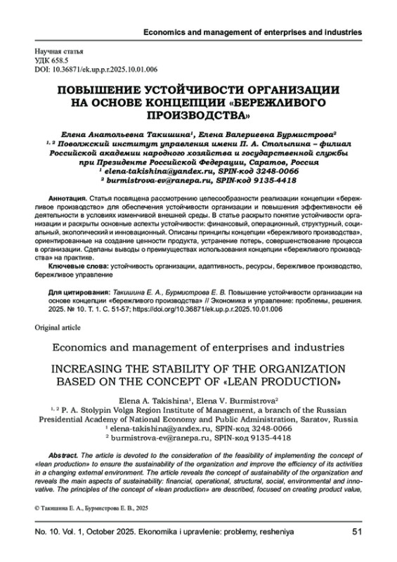 Статья посвящена рассмотрению целесообразности реализации концепции «бережливое производство» для обеспечения устойчивости организации и повышения эффективности её деятельности в условиях изменчивой внешней среды. В статье раскрыто понятие устойчивости организации и раскрыты основные аспекты устойчивости: финансовый, операционный, структурный, социальный, экологический и инновационный. Описаны принципы концепции «бережливого производства», ориентированные на создание ценности продукта, устранение потерь, совершенствование процесса в организации. Сделаны выводы о преимуществах использования концепции «бережливого производства» на практике.