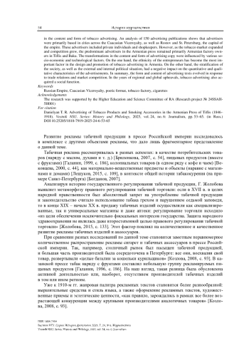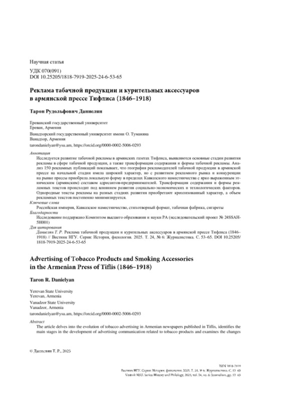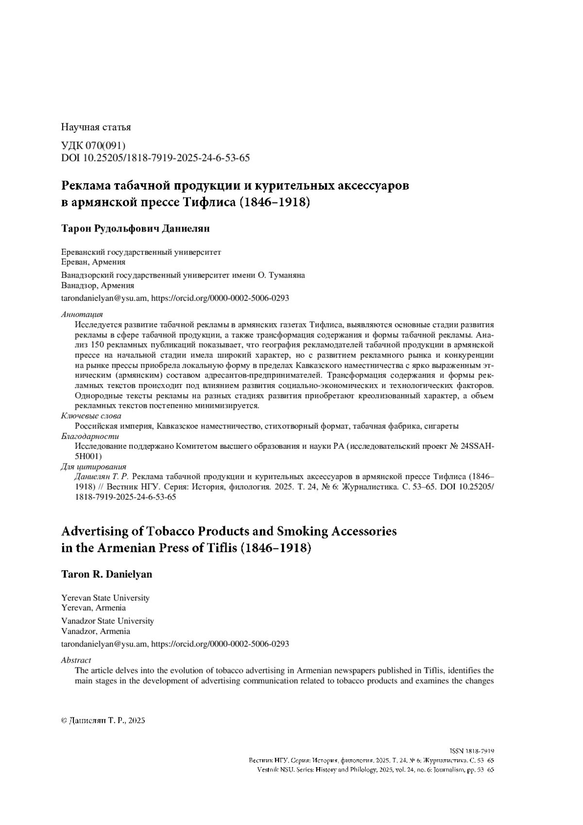 Исследуется развитие табачной рекламы в армянских газетах Тифлиса, выявляются основные стадии развития рекламы в сфере табачной продукции, а также трансформация содержания и формы табачной рекламы. Анализ 150 рекламных публикаций показывает, что география рекламодателей табачной продукции в армянской прессе на начальной стадии имела широкий характер, но с развитием рекламного рынка и конкуренции на рынке прессы приобрела локальную форму в пределах Кавказского наместничества с ярко выраженным этническим (армянским) составом адресантов-предпринимателей. Трансформация содержания и формы рекламных текстов происходит под влиянием развития социально-экономических и технологических факторов. Однородные тексты рекламы на разных стадиях развития приобретают креолизованный характер, а объем рекламных текстов постепенно минимизируется.