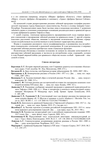 6. Даниелян Т. Р. Рекламные сообщения западной продукции в армянской периодической печати Тифлиса (1860-1890 гг.) // Язык и литература в контексте межкультурной комму никации: Материалы IV Междунар. науч. конф. Ереван: Арман Асмангулян, 2016. С. 405-409.