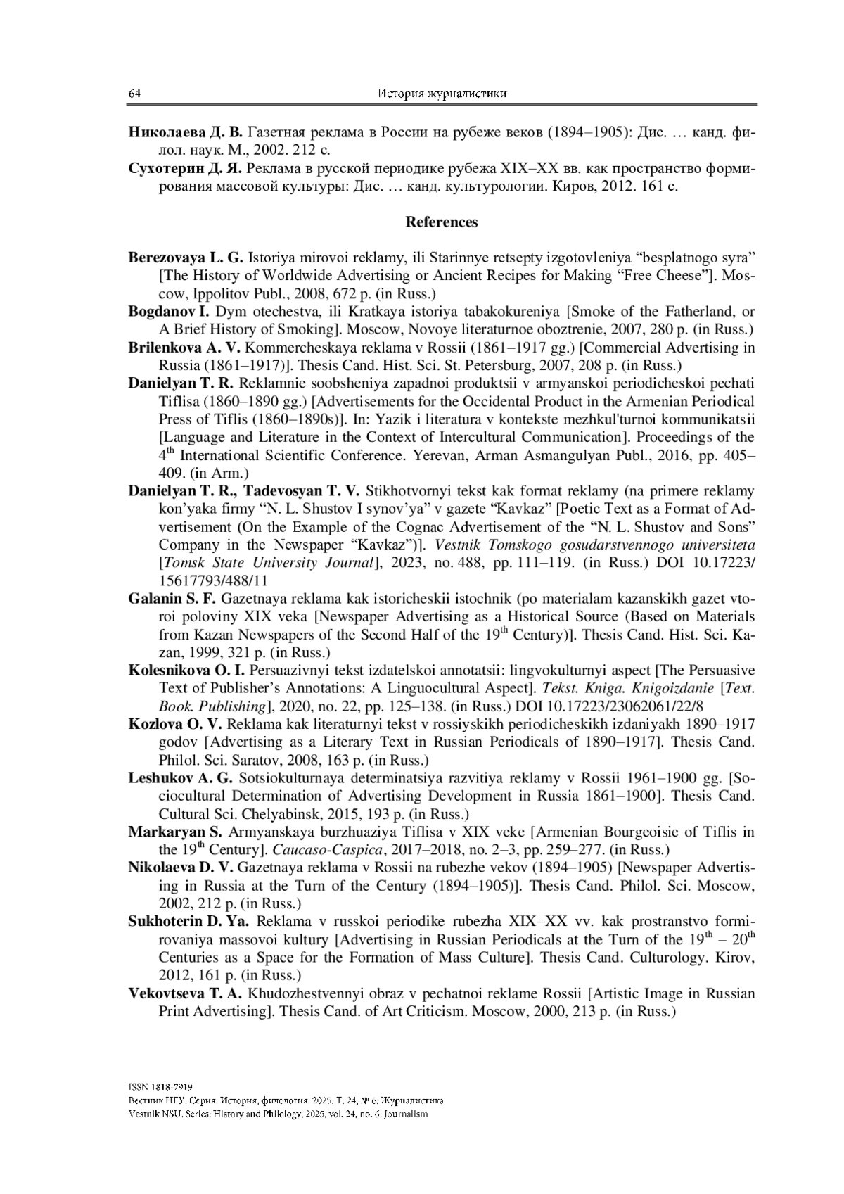 7. Даниелян Т. Р., Тадевосян Т. В. Стихотворный текст как формат рекламы (на примере рекламы коньяка фирмы «Н. Л. Шустов и сыновья» в газете «Кавказ») // Вестник Том. гос. ун-та. 2023. № 488. С. 111-119. https://doi.org/10.17223/15617793/488/11