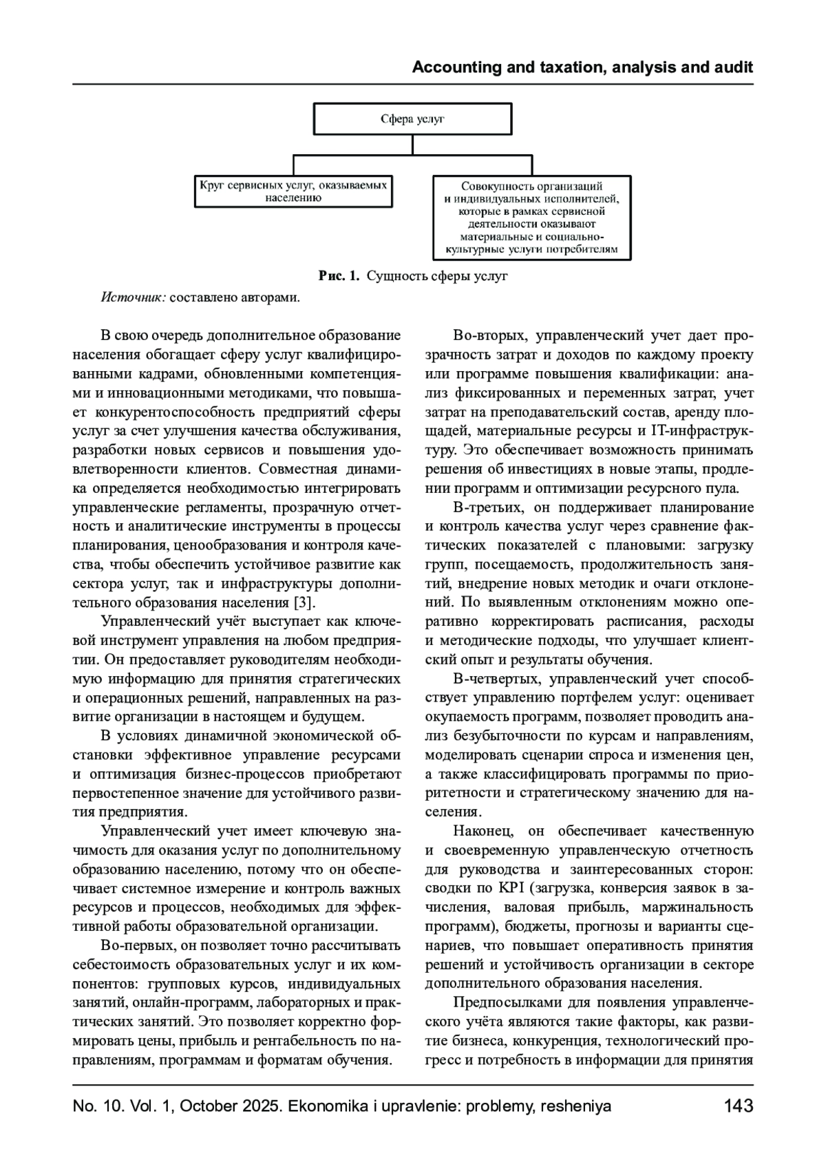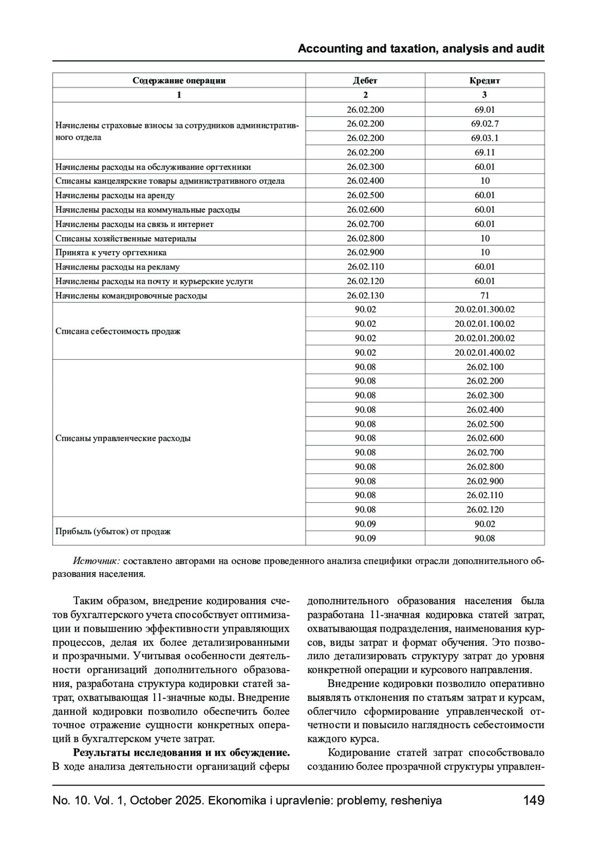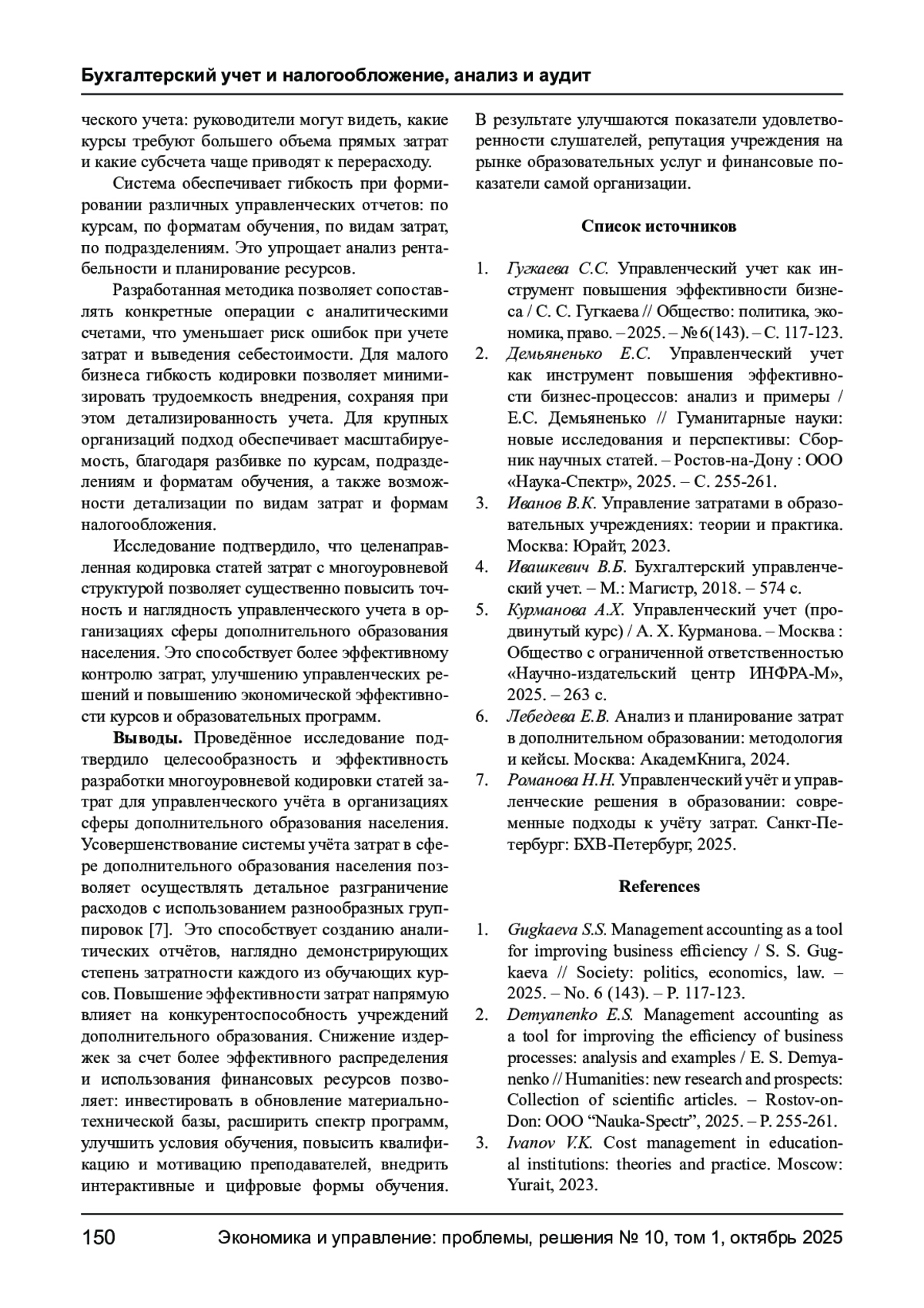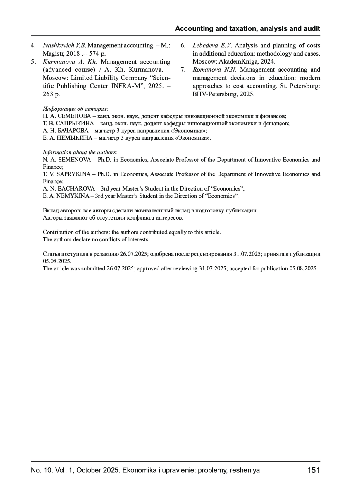 СЕМЕНОВА Н. А., САПРЫКИНА Т. В., БАЧАРОВА А. Н., НЕМЫКИНА Е. А. НАПРАВЛЕНИЯ ПОВЫШЕНИЯ ЭФФЕКТИВНОСТИ УЧЕТА ЗАТРАТ В СИСТЕМЕ ДОПОЛНИТЕЛЬНОГО ОБРАЗОВАНИЯ НАСЕЛЕНИЯ // ЭКОНОМИКА И УПРАВЛЕНИЕ: ПРОБЛЕМЫ, РЕШЕНИЯ. 2025. ТОМ 1 № 10