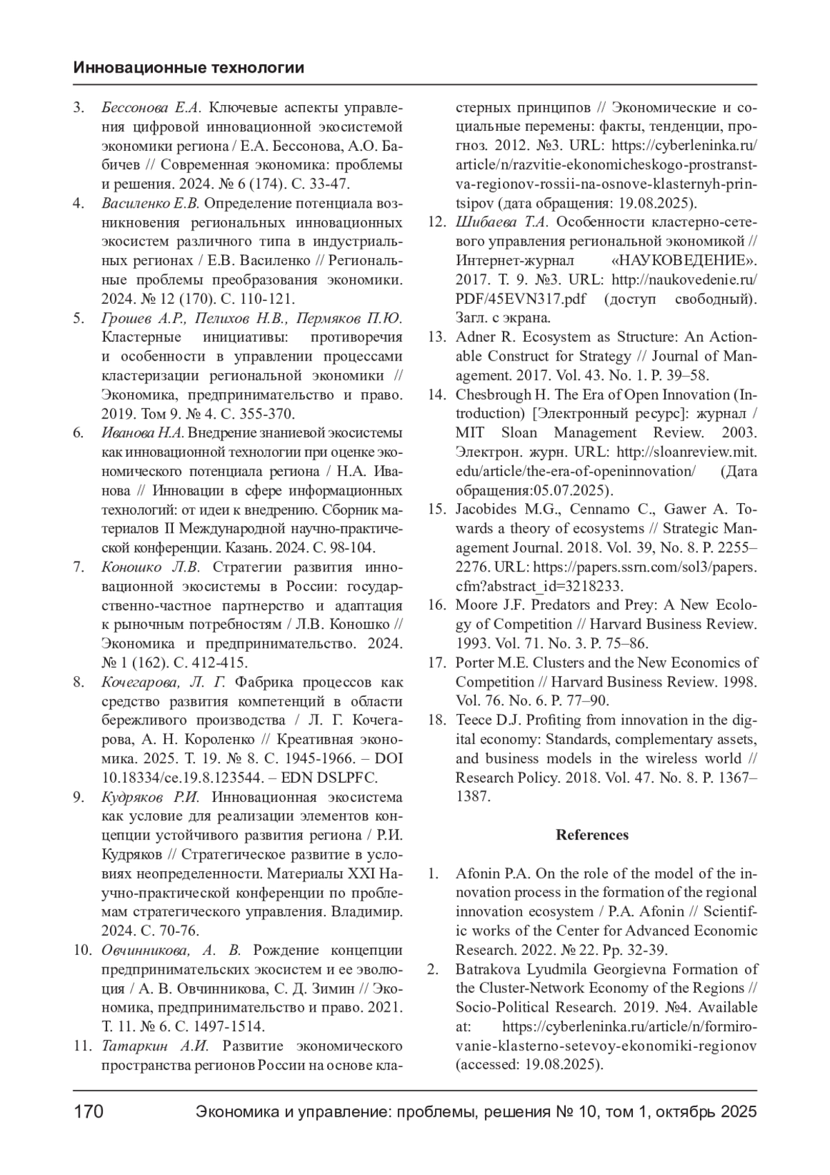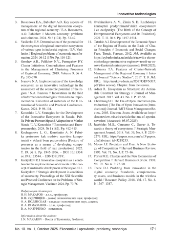 3. Бессонова Е.А. Ключевые аспекты управления цифровой инновационной экосистемой экономики региона / Е.А. Бессонова, А.О. Бабичев // Современная экономика: проблемы и решения. 2024. № 6 (174). С. 33-47. EDN: APDDLD