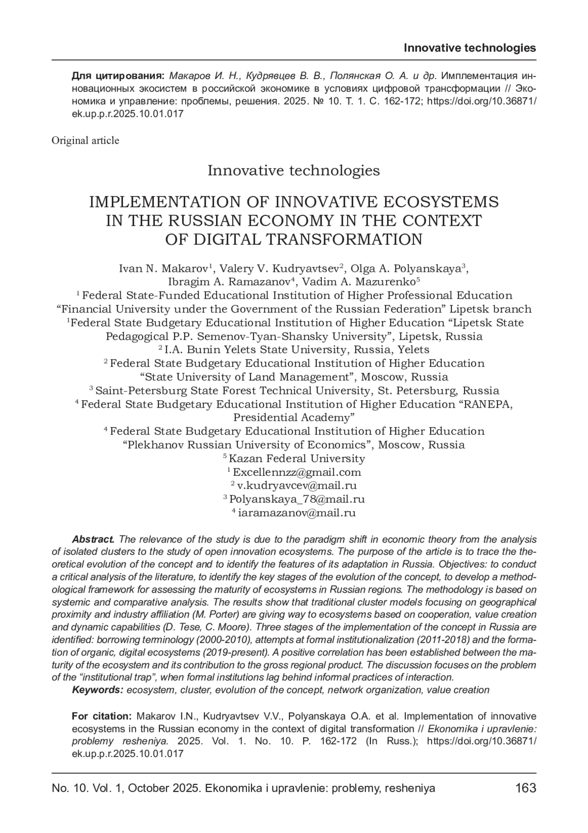 Задачи: провести критический анализ литературы, выделить ключевые этапы эволюции концепции, разработать методологический каркас для оценки зрелости экосистем в российских регионах. Методология основана на системном и компаративном анализе. Результаты показывают, что традиционные кластерные модели, фокусирующиеся на географической близости и отраслевой принадлежности (М. Портер), уступают место экосистемам, основанным на кооперации, создании ценности и динамических способностях (Д. Тесе, К. Мур). Выявлены три стадии имплементации концепции в России: заимствование терминологии (2000-2010), попытки формальной институционализации (2011-2018) и становление органических, цифровых экосистем (2019-н. в.). Установлена положительная корреляция между зрелостью экосистемы и ее вкладом в валовой региональный продукт. Обсуждение фокусируется на проблеме «институциональной ловушки», когда формальные институты отстают от неформальных практик взаимодействия.