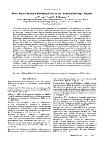 16. Демаков Ю.П., Исаев А.В., Шарафутдинов Р.Н. Роль лесной подстилки в борах Марийского Заволжья и вариабельность ее параметров // Научные труды государственного природного заповедника “Большая Кокшага”. Вып. 8. Йошкар-Ола: ПГТУ, 2017. С. 15-43. EDN: ZWLUAL