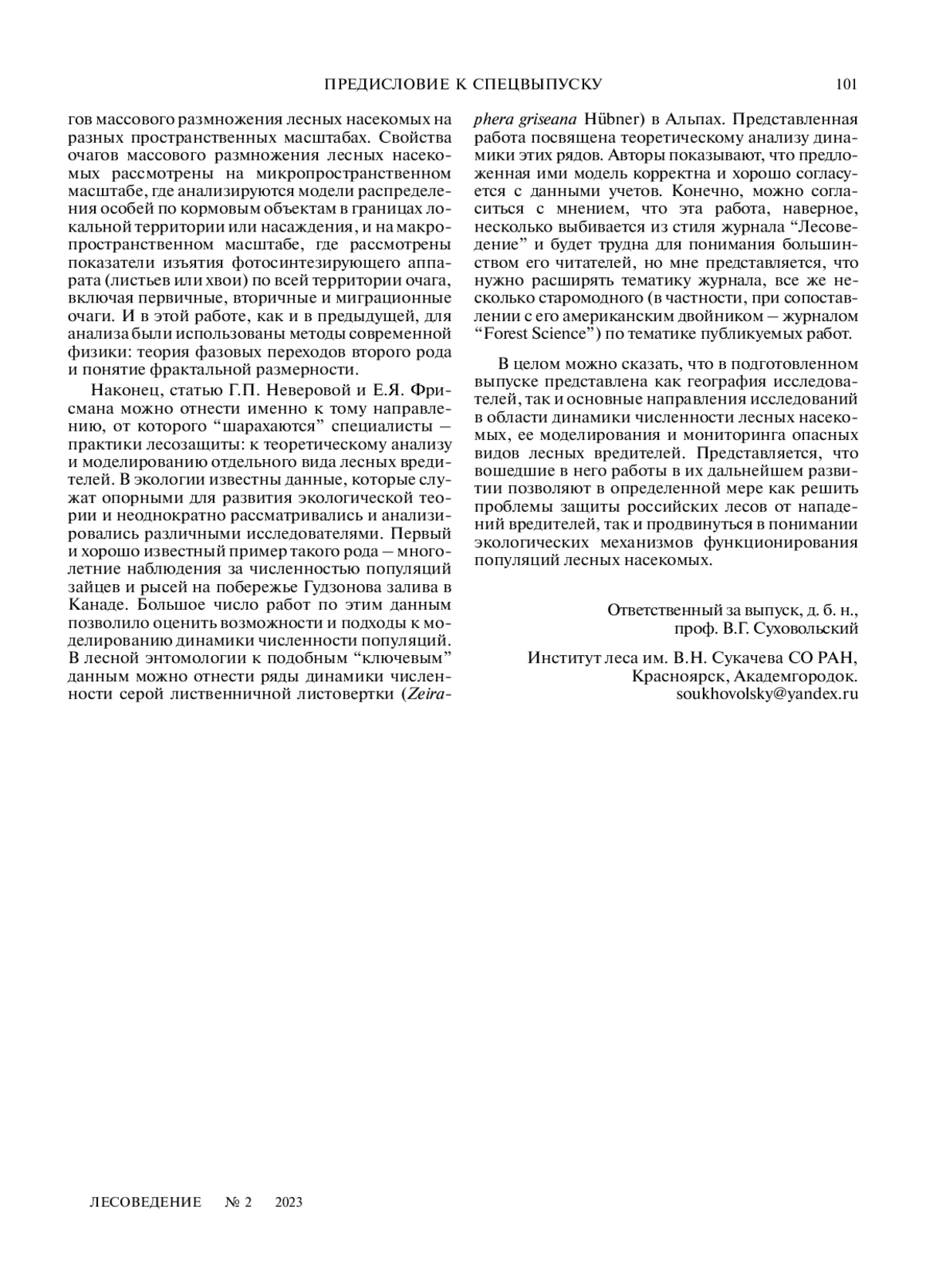 Работа посвящена обсуждению возможностей описания динамики развития очагов массового размножения лесных насекомых на разных пространственных масштабах. Свойства очагов массового размножения рассмотрены на микропространственном масштабе, где анализируются модели распределения особей по кормовым объектам в границах локальной территории или насаждения, и на макропространственном масштабе, где рассмотрены показатели изъятия фотосинтезирующего аппарата (листьев или хвои) по всей территории очага, включая первичные, вторичные и миграционные очаги. При анализе микропространственного распределения гусениц на деревьях в очагах на разных фазах градации была использована модель распределения особей на кормовых деревьях как фазового перехода второго рода. Макропространственные процессы, происходящие в ходе роста очага, включают, во-первых, рост существующего очага и появление новых связных поврежденных участков леса, во-вторых, появление новых несвязных вторичных очагов. В качестве характеристик очагов массового размножения используются их фрактальная размерность D и характеристики “вязких пальцев” на границе очага. Для расчетов этих характеристик применены данные спутникового зондирования. Предлагаемые подходы могут быть использованы для прогноза развития очагов массового размножения лесных насекомых. При построении и верификации моделей применены данные учетов численности сибирского шелкопряда и заселенности деревьев в очагах его массового размножения, дистанционные данные по площадям и форме очагов в районах Красноярского края в ходе вспышки массового размножения сибирского шелкопряда (Dendrolimus sibiricus Tschetv.) в 2015–2019 гг.