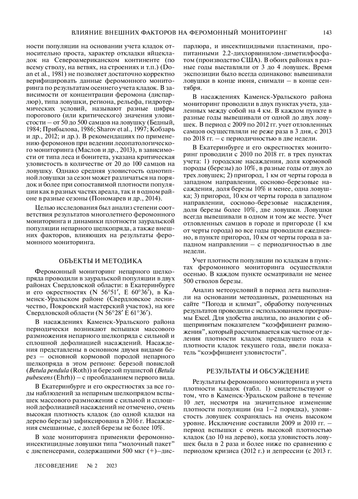Метод феромонного мониторинга в системе надзора за плотностью вредителей приобрел широкую популярность ввиду его относительной простоты. Целью исследования был анализ степени соответствия результатов феромонного мониторинга и динамики плотности популяции непарного шелкопряда (Lymantria dispar (L.)), а также внешних факторов, влияющих на результаты феромонного мониторинга. Феромонный мониторинг проводили на ареале зауральской популяции в Свердловской области, в двух районах – с высокой плотностью популяции и периодическими вспышками массового размножения и очень низкой плотностью, с отсутствием периодических вспышек массового размножения в течение 10 лет. Параллельно с феромонным мониторингом проводили мониторинг плотности популяции на основании осеннего учета кладок. Результаты многолетнего феромонного мониторинга непарного шелкопряда позволяют прийти к следующим выводам. Основное влияние на уловистость ловушек оказывают погодные условия, в том числе температура воздуха и устойчивость воздушных потоков в период лета самцов. Плотность кладок и коэффициент размножения популяции непарного шелкопряда могут оказывать влияние на результаты феромонного мониторинга, но они не являются определяющими. Делать прогнозы изменения плотности популяции этого вида можно только при детальном феромонном мониторинге с точным фиксированием периода основного лета самцов и на основании поправочных коэффициентов, учитывающих погодные условия. Экономическая целесообразность такого рода работ с целью оценки плотности вредителя и слежения за динамикой численности представляется авторам сомнительной
