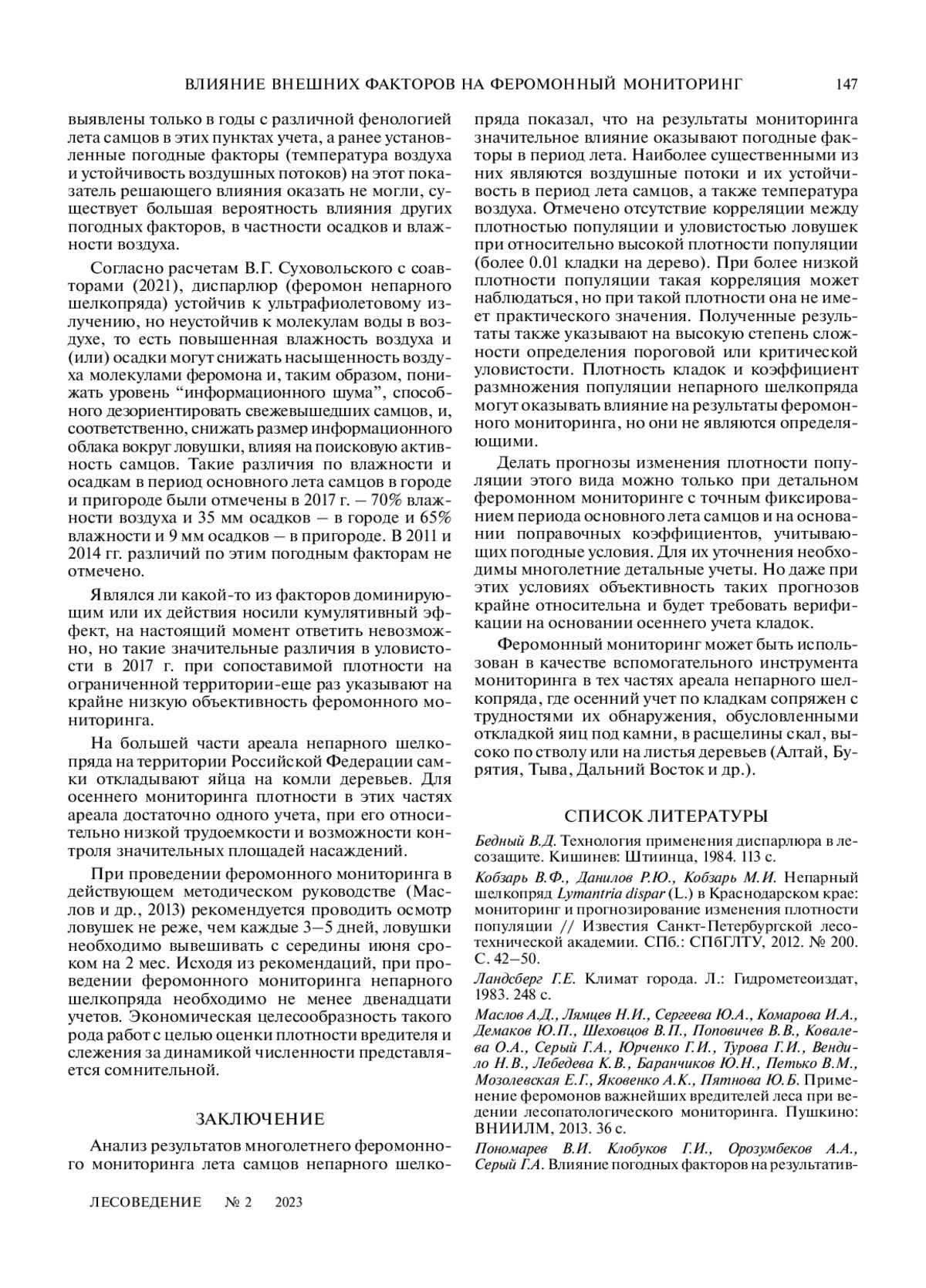 5. Пономарев В.И. Клобуков Г.И., Орозумбеков А.А., Серый Г.А. Влияние погодных факторов на результативность феромонного мониторинга непарного шелкопряда Lymantria dispar (L.) // Известия Санкт-Петербургской лесотехнической академии. СПб.: СПбГЛТУ, 2014. № 207. С. 202-211. EDN: RHBIGR