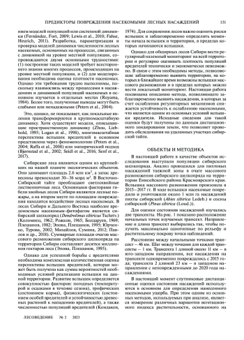 Вспышки массового размножения сибирского шелкопряда (Dendrolimus sibiricus Tschetv.) в таежных лесах Сибири начинаются с очагов площадями в единицы га и достигают площадей в сотни тысяч га, что ведет к значительным повреждениям лесов. Границы очагов изменяются во времени и пространстве в зависимости от внешних факторов, динамики популяции и состояния кормовых деревьев. Борьбу с вредителем необходимо начинать за 1–2 года до достижения пика плотности популяции насекомого. В связи с этим важно знать предикторы повышения численности вредителя, заблаговременно определять момент начала вспышек и зоны, в пределах которых возникают вспышки. Для оценки необходимых условий возникновения вспышки предлагается метод оценки состояния лесных насаждений по данным дистанционного зондирования Земли (ДЗЗ)