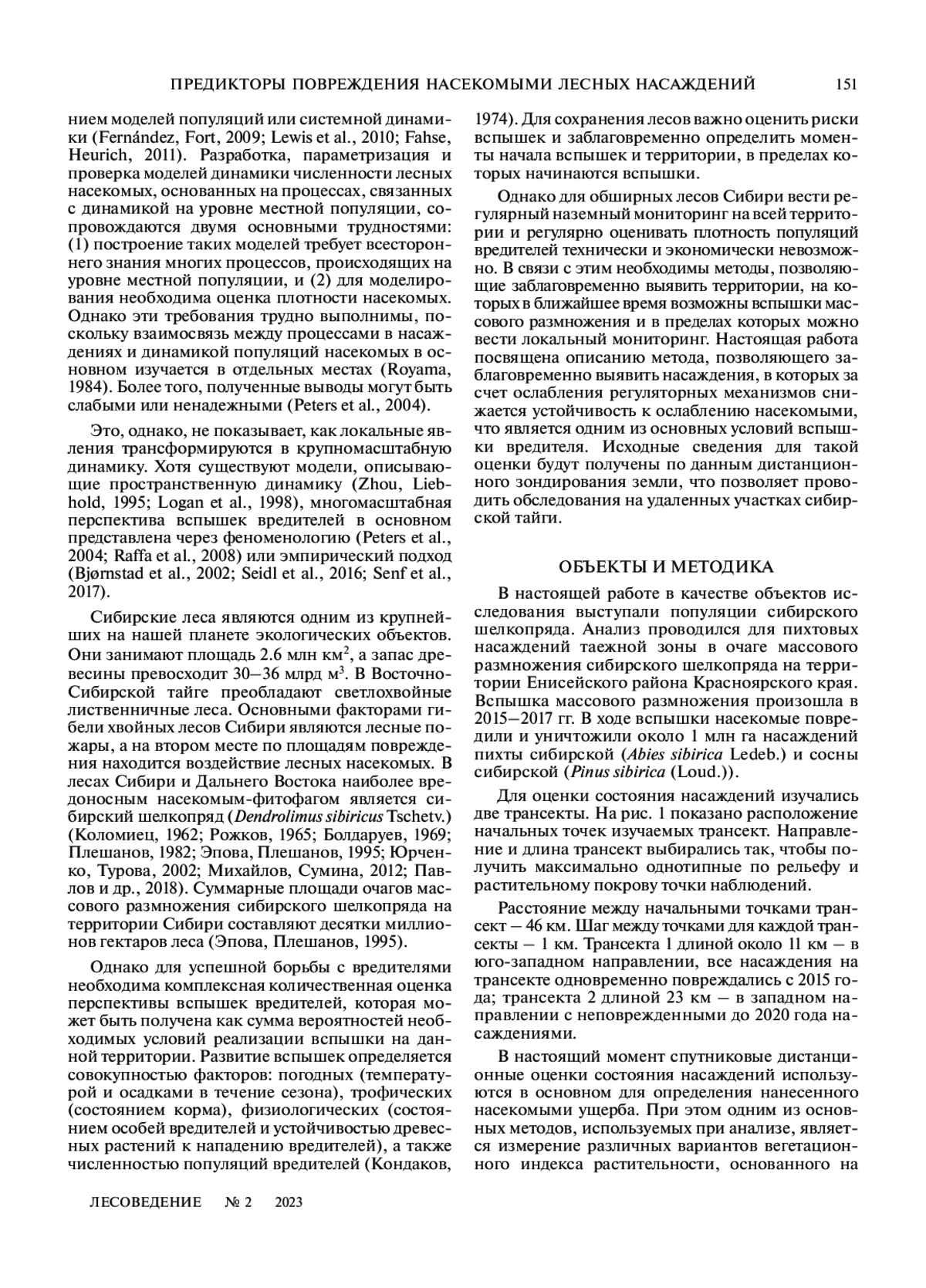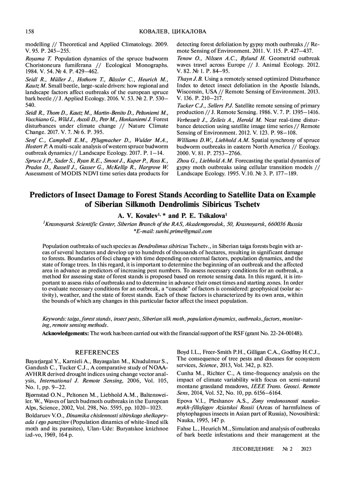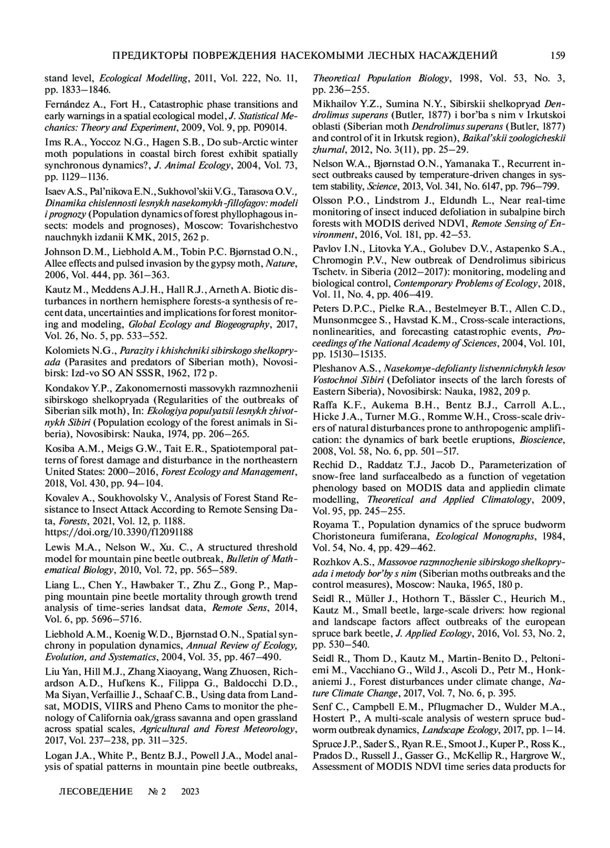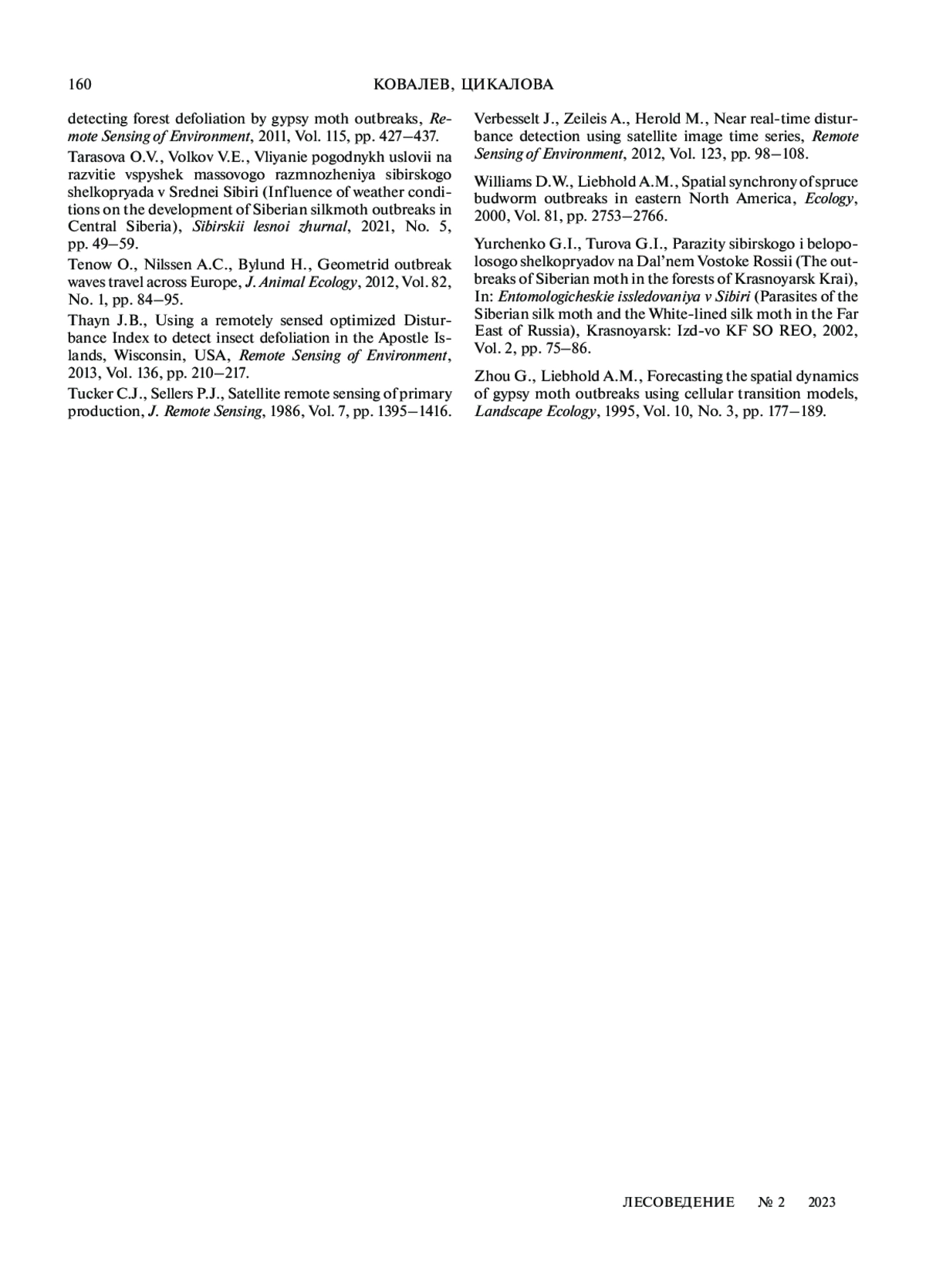 22. Kovalev A., Soukhovolsky V. Analysis of Forest Stand Resistance to Insect Attack According to Remote Sensing Data // Forests. 2021. V. 12. P. 1188. DOI: 10.3390/f12091188 EDN: UZETDU