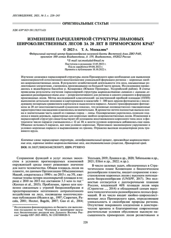 18. Москалюк Т.А. Трансформация травяного яруса за 20 лет восстановительной сукцессии в широколиственных лесах с лиановой растительностью на юге Приморского края // Комаровские чтения, 2021. Вып. LXIX. С. 26–78.