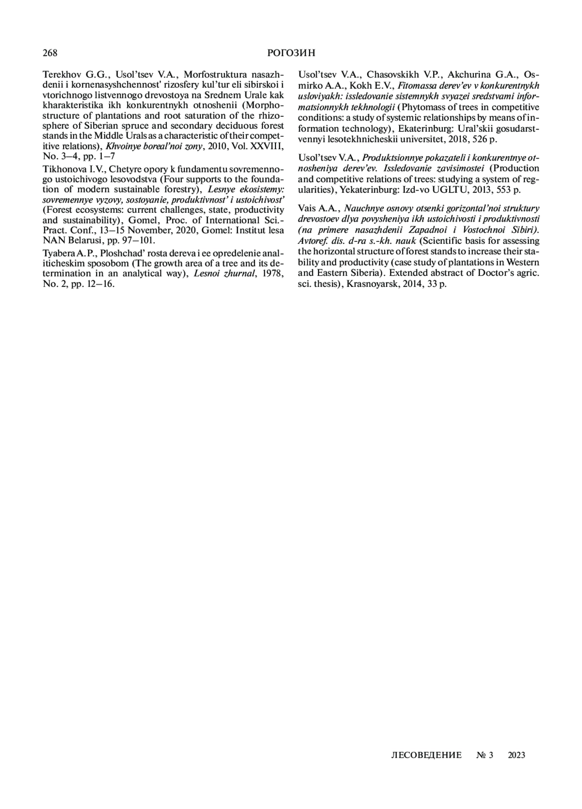 35. Терехов Г.Г., Усольцев В.А. Морфоструктура насаждений и корненасыщенность ризосферы культур ели сибирской и вторичного лиственного древостоя на Среднем Урале как характеристика их конкурентных отношений // Хвойные бореальной зоны. 2010. Т. XXVIII. № 3–4. С. 1–7. EDN: OKHPGR