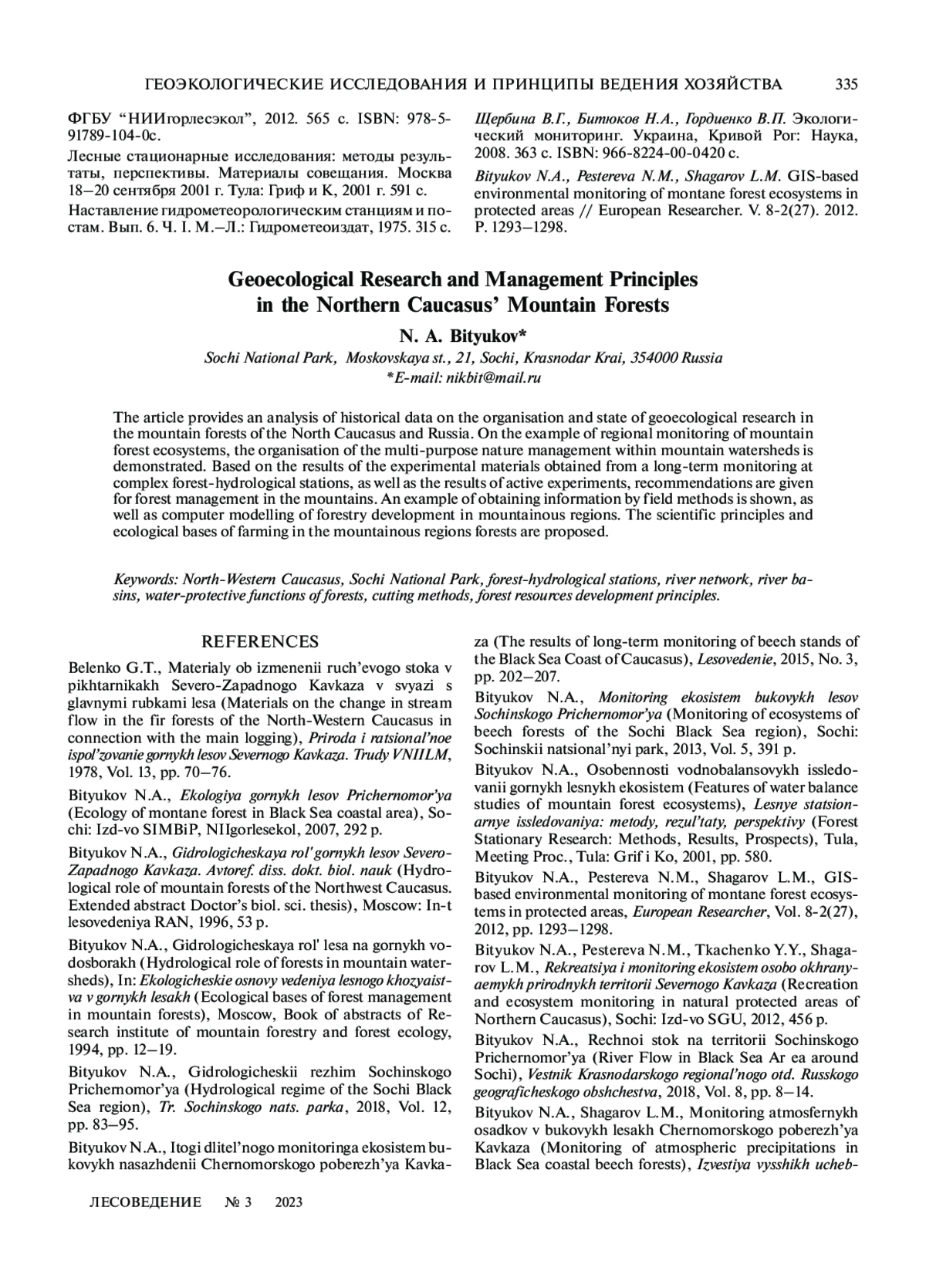 15. Битюков Н.А., Шагаров Л.М. Влияние рубок главного пользования на водный баланс малых водосборов в буковых лесах Северо-Западного Кавказа // Лесоведение. 2020. № 4. 2020. С. 1–13. EDN: RCCEMC