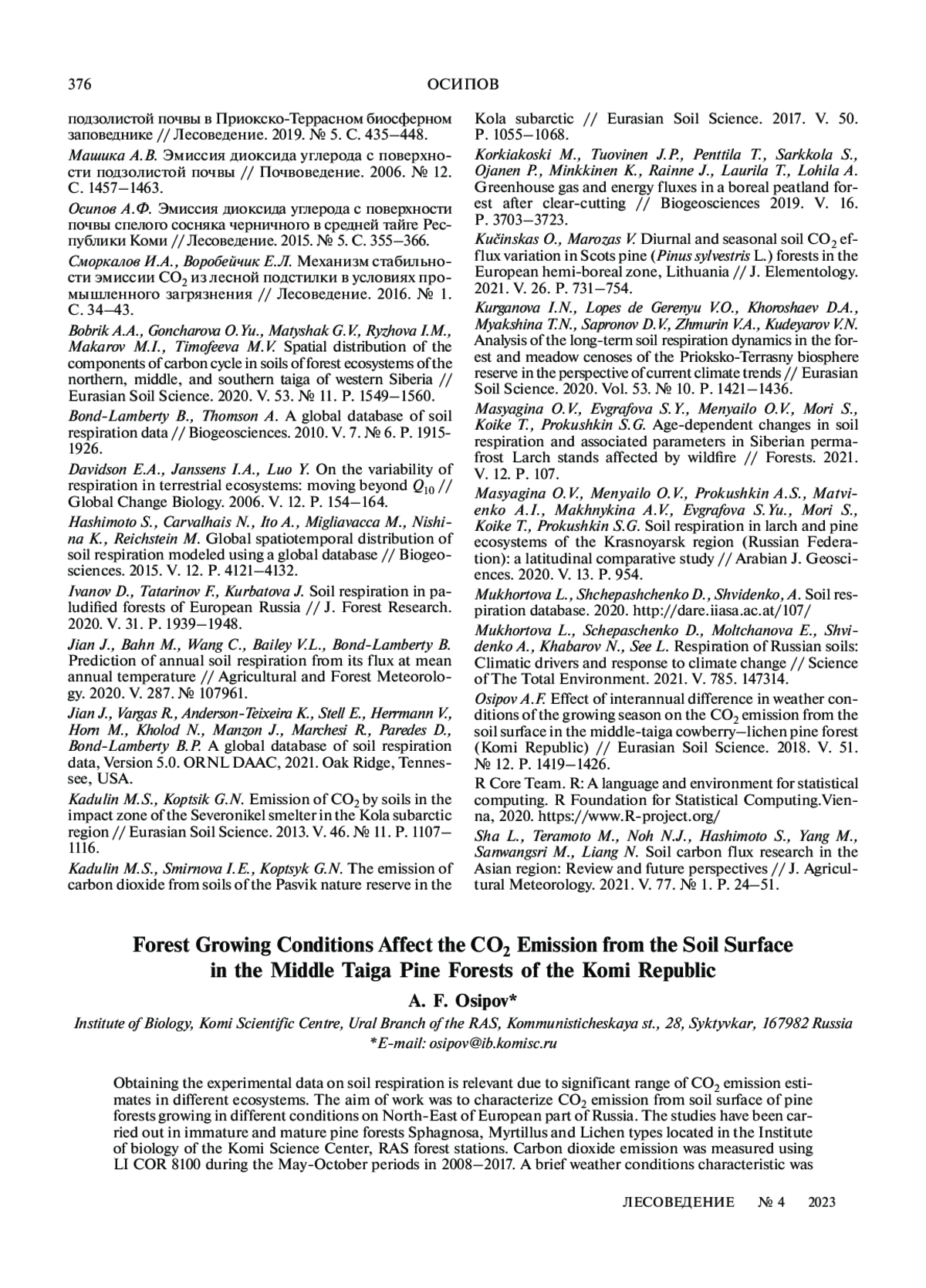 24. Osipov A.F. Effect of interannual difference in weather conditions of the growing season on the CO2 emission from the soil surface in the middle-taiga cowberry–lichen pine forest (Komi Republic) // Eurasian Soil Science. 2018. V. 51. № 12. P. 1419–1426. EDN: WUOIPD