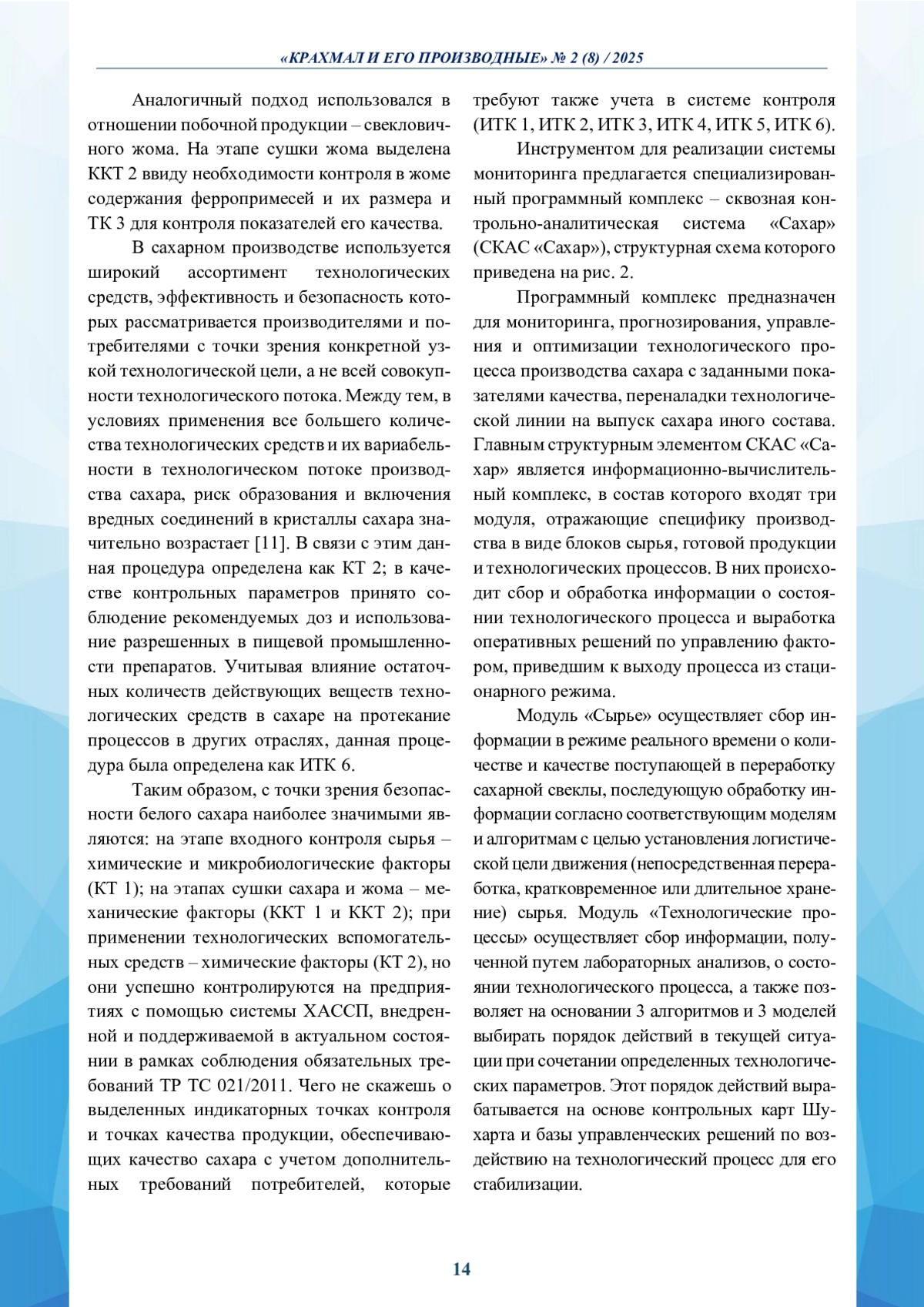В современных условиях на пищевых предприятиях все большую значимость приобретает одновременное обеспечение безопасности и качества в виде интегрированного контроля технологического потока. Рассмотрены аспекты формирования структуры мониторинга технологического потока производства белого свекловичного сахара. Показана необходимость выделения контрольных точек, индикаторных точек качества, критических контрольных точек, которые в совокупности гарантируют поддержание качества и безопасности белого сахара. В системе мониторинга выделено 3 точки качества, 2 критические контрольные точки, 6 индикаторных точек качества. В качестве инструмента системы мониторинга предложен специализированный программный комплекс – сквозная контрольно-аналитическая система «Сахар» (СКАС «Сахар»).