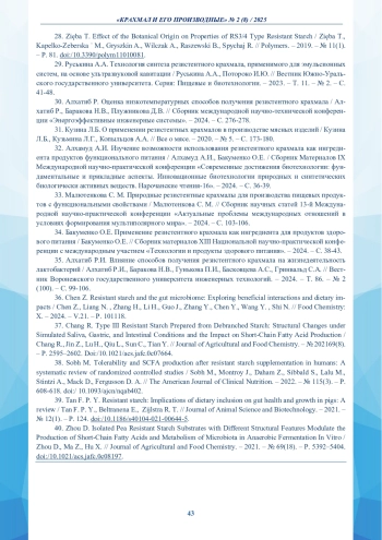 36. Chen Z. Resistant starch and the gut microbiome: Exploring beneficial interactions and dietary impacts / Chen Z., Liang N., Zhang H., Li H., Guo J., Zhang Y., Chen Y., Wang Y., Shi N. // Food Chemistry: X. - 2024. - V.21. - Р. 101118.