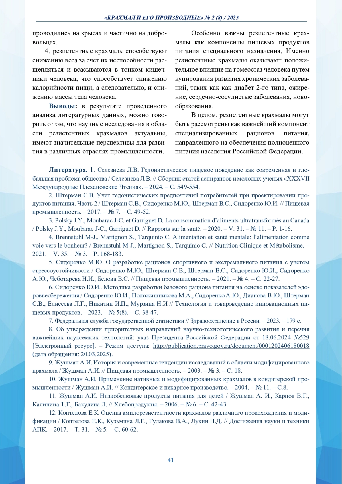 9. Жушман А.И. История и современные тенденции исследований в области модифицированного крахмала / Жушман А.И. // Пищевая промышленность. - 2003. - № 3. - С. 18.