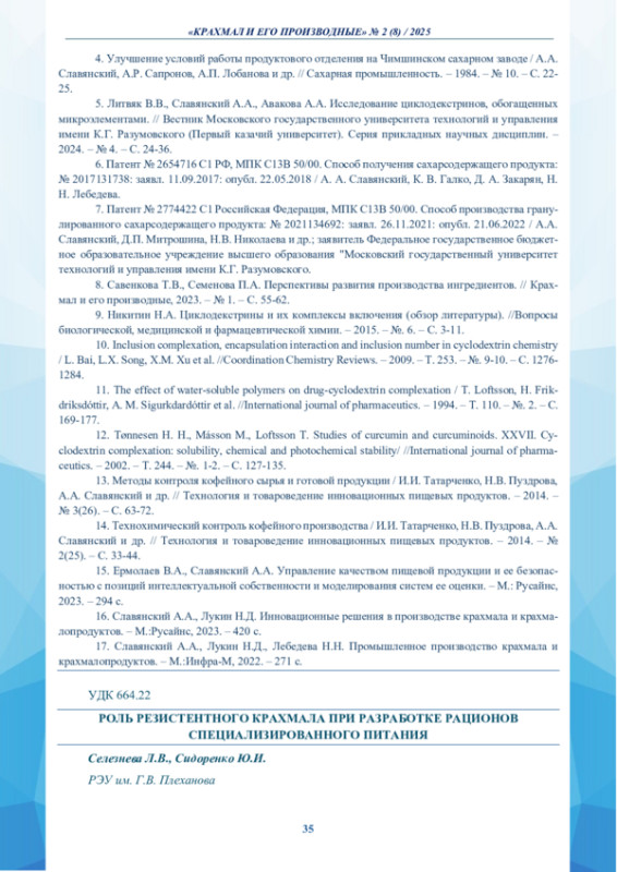 33. Малютенкова С. М. Природные резистентные крахмалы для производства пищевых продуктов с функциональными свойствами / Малютенкова С. М. // Сборник научных статей 13-й Международной научно - практической конференции “Актуальные проблемы международных отношений в условиях формирования мультиполярного мира”. - 2024. - С. 103-106.