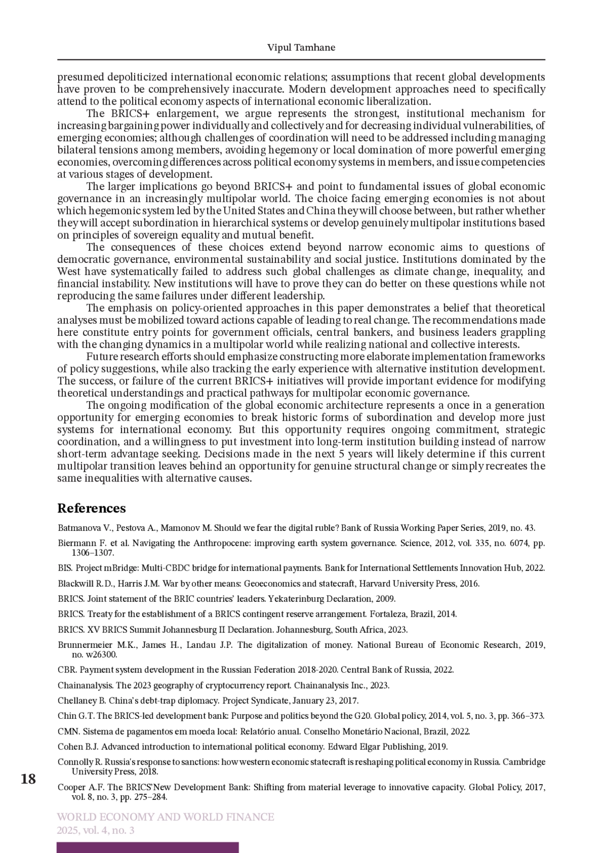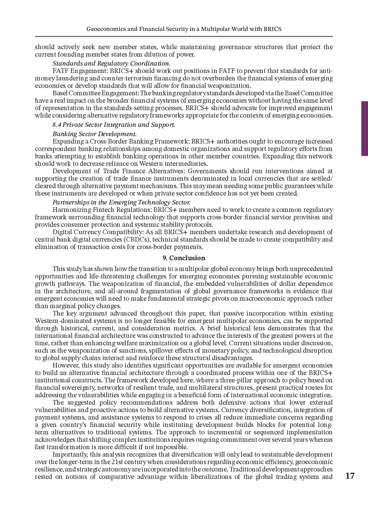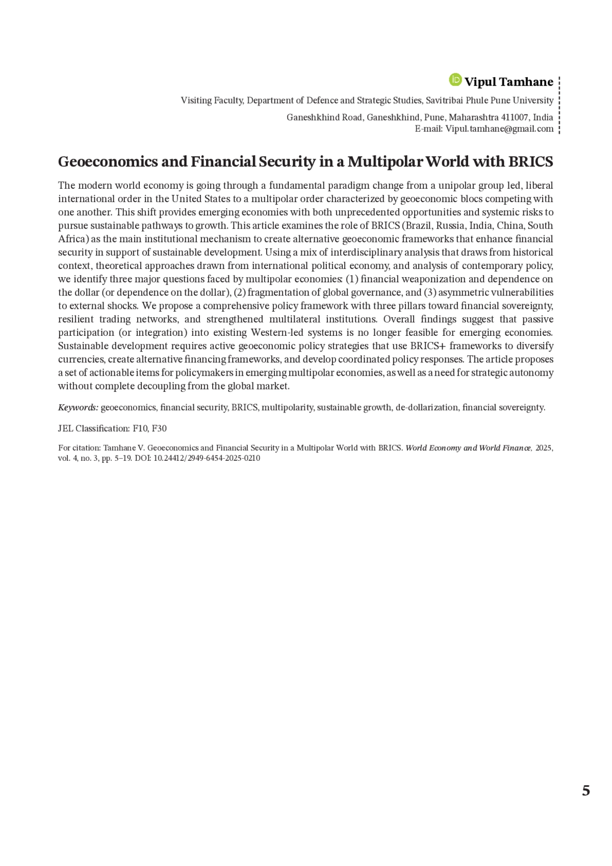 Современная мировая экономика переживает фундаментальную смену парадигмы: от либерального международного порядка, возглавляемого США, к многополярному порядку, характеризующемуся конкурирующими друг с другом геоэкономическими блоками. Этот сдвиг создает для развивающихся экономик как беспрецедентные возможности, так и системные риски для поиска устойчивых путей роста. В данной статье рассматривается роль БРИКС (Бразилия, Россия, Индия, Китай, Южная Африка) как основного институционального механизма для создания альтернативных геоэкономических структур, укрепляющих финансовую безопасность в поддержку устойчивого развития. Используя сочетание междисциплинарного анализа, основанного на историческом контексте, теоретических подходов, заимствованных из международной политической экономии, и анализа современной политики, мы выделяем три основных вопроса, стоящих перед многополярными экономиками: (1) использование финансового оружия и зависимость от доллара, (2) фрагментация глобального управления и (3) асимметричная уязвимость к внешним шокам. Мы предлагаем комплексную политическую концепцию, основанную на трёх столпах: финансовый суверенитет, устойчивые торговые сети и укрепление многосторонних институтов. Общие выводы свидетельствуют о том, что пассивное участие (или интеграция) в существующие системы, ориентированные на Запад, больше не представляется возможным для развивающихся экономик. Устойчивое развитие требует активных стратегий геоэкономической политики, использующих рамки БРИКС+ для диверсификации валют, создания альтернативных механизмов финансирования и разработки скоординированных мер политики. В статье предлагается набор практических мер для политиков в развивающихся многополярных экономиках, а также подчеркивается необходимость стратегической автономии без полного отделения от мирового рынка.