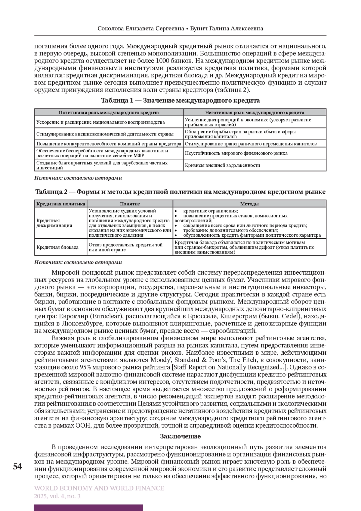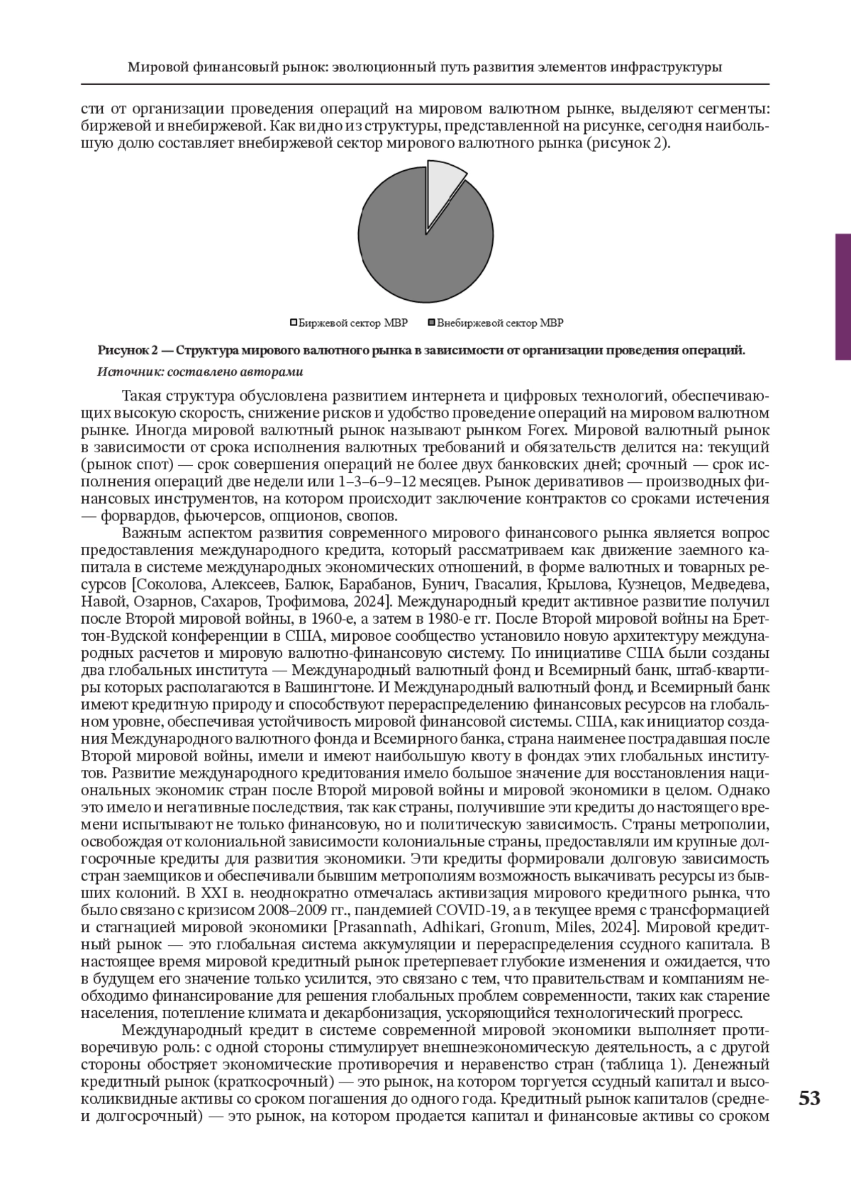 Современный мировой финансовый рынок прошел достаточно длинный и противоречивый эволюционный путь развития, беря свое начало в VIII в. Развитие мирового хозяйства, кооперационного взаимодействия, межстранового производства привело к увеличению финансовой составляющей в мировой экономике и как следствие выделения финансового рынка в отдельную значимую систему международных отношений. Современная концептуальная основа международного финансового рынка имеет достаточно структурированную и методологически обоснованную конструкцию, реализующую современный уровень развития международных экономических отношений. В статье рассмотрена инфраструктура мирового финансового рынка в разрезе институциональных, правовых, платежно-расчетных, коммуникационных и информационных элементов. Каждый элемент инфраструктуры международного финансового рынка представлен как система институтов, обеспечивающих достижение эффективного функционирования мировой финансовой системы в целом. В частности, институциональная инфраструктура современного мирового финансового рынка рассматривается как система международных и региональных финансовых институтов, а платежно-расчетная инфраструктура через призму взаимосвязанных элементов, которые обеспечивают движение валютных ценностей на международном уровне в системе внешнеэкономической, международной кредитной и инвестиционной деятельности. Отмечено, что на современном этапе развития финансовых технологий появились цифровые финансовые инструменты, формирующие инновационные новые сегменты финансового рынка. В статье также приведен анализ развития мирового кредитного рынка и роль международного кредита в современной мировой экономике. Особое место в статье уделено значению фондового рынка и его влиянию на систему перераспределения инвестиционных ресурсов.