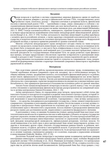 Среди вопросов и проблем в системе современных мировых финансов одним из наиболее острых является доверие к доллару и финансовой системе США, государственному долгу развитых стран, поскольку доллар — мировая ключевая и резервная валюта, финансовая система и финансовый рынок США — крупнейшие в мире, самые ликвидные и глубокие с неограниченными финансовыми возможностями для всех мегасубъектов, да и в целом финансовые центры других развитых стран играют не менее значимую роль для инвестиций [Moiseienko, 2023. P. 1009]. Отсюда платежеспособность, ликвидность, гарантия возврата вложенных средств и активов представляются важнейшими качествами международной инвестиционной деятельности [Kempf et al., 2023. P. 159]. Особую актуальность тематика инвестиций за рубеж приобрела с момента ареста российских активов, а также характера отношений исполнительной власти государства и вопросов независимости политики центральных банков, прежде всего Федеральной резервной системы, в процессе принятия решений по уровню ключевой ставки.