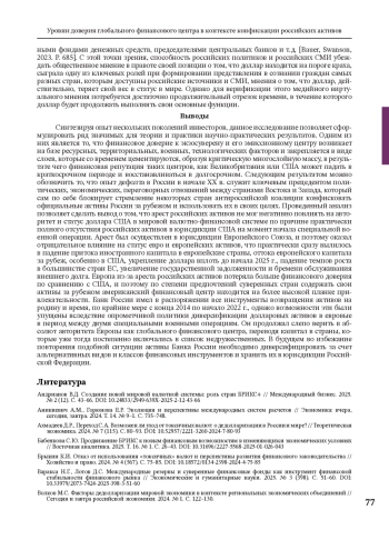 13. Кузнецов А.В. Фрагментация мировой валютно-финансовой системы в условиях роста геополитической напряженности // Вестник Российского университета дружбы народов. Серия: Международные отношения. 2025. Т. 25. № 1. С. 56-66. DOI: 10.22363/2313-0660-2025-25-1-56-66