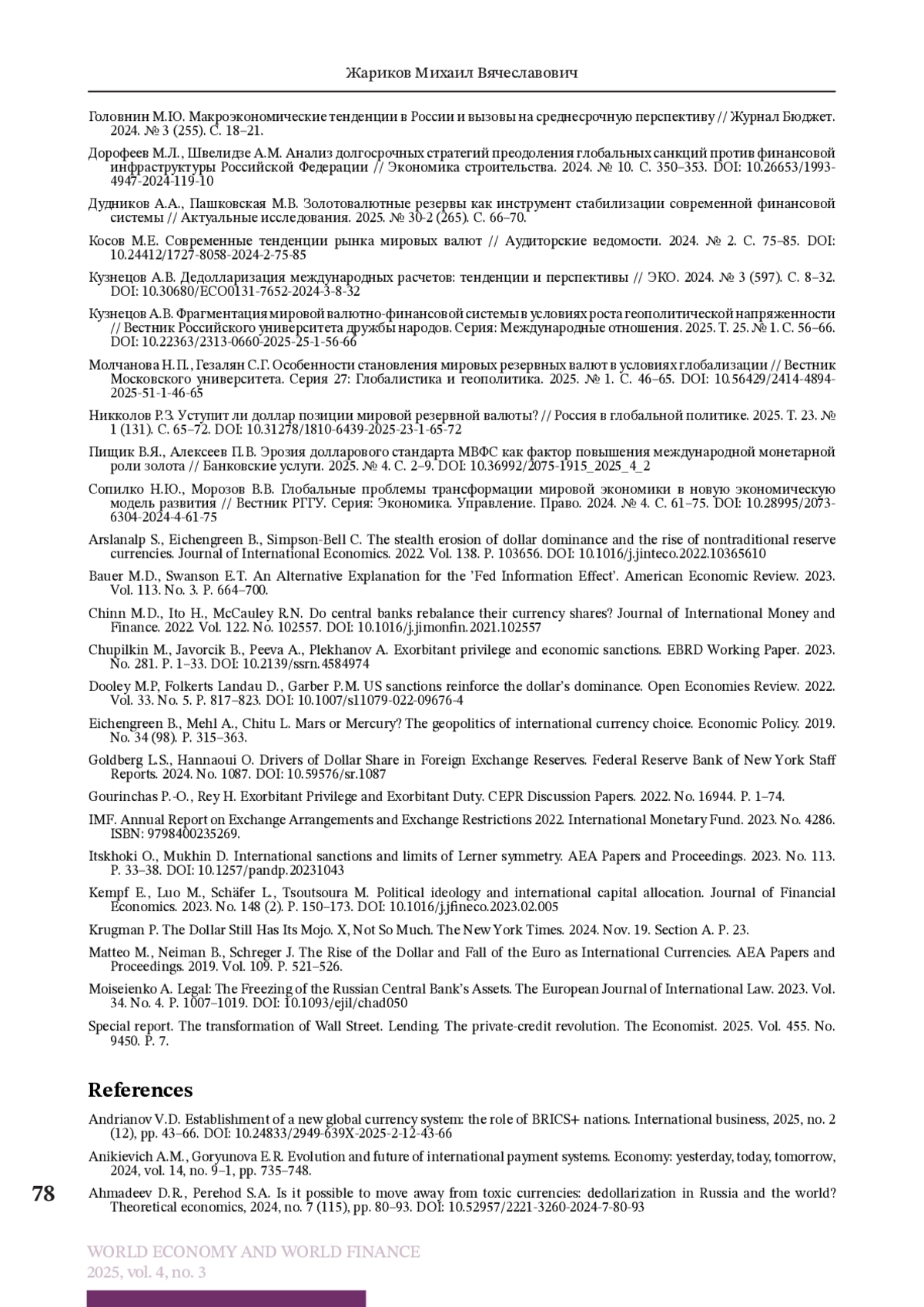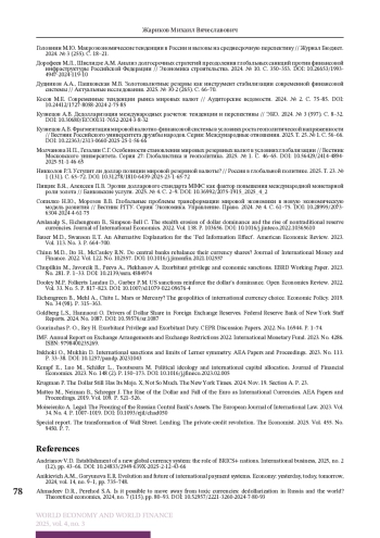 3. Ахмадеев Д.Р., Переход С.А. Возможен ли уход от токсичных валют: о дедолларизации в России и мире? // Теоретическая экономика. 2024. № 7 (115). С. 80-93. DOI: 10.52957/2221-3260-2024-7-80-93
