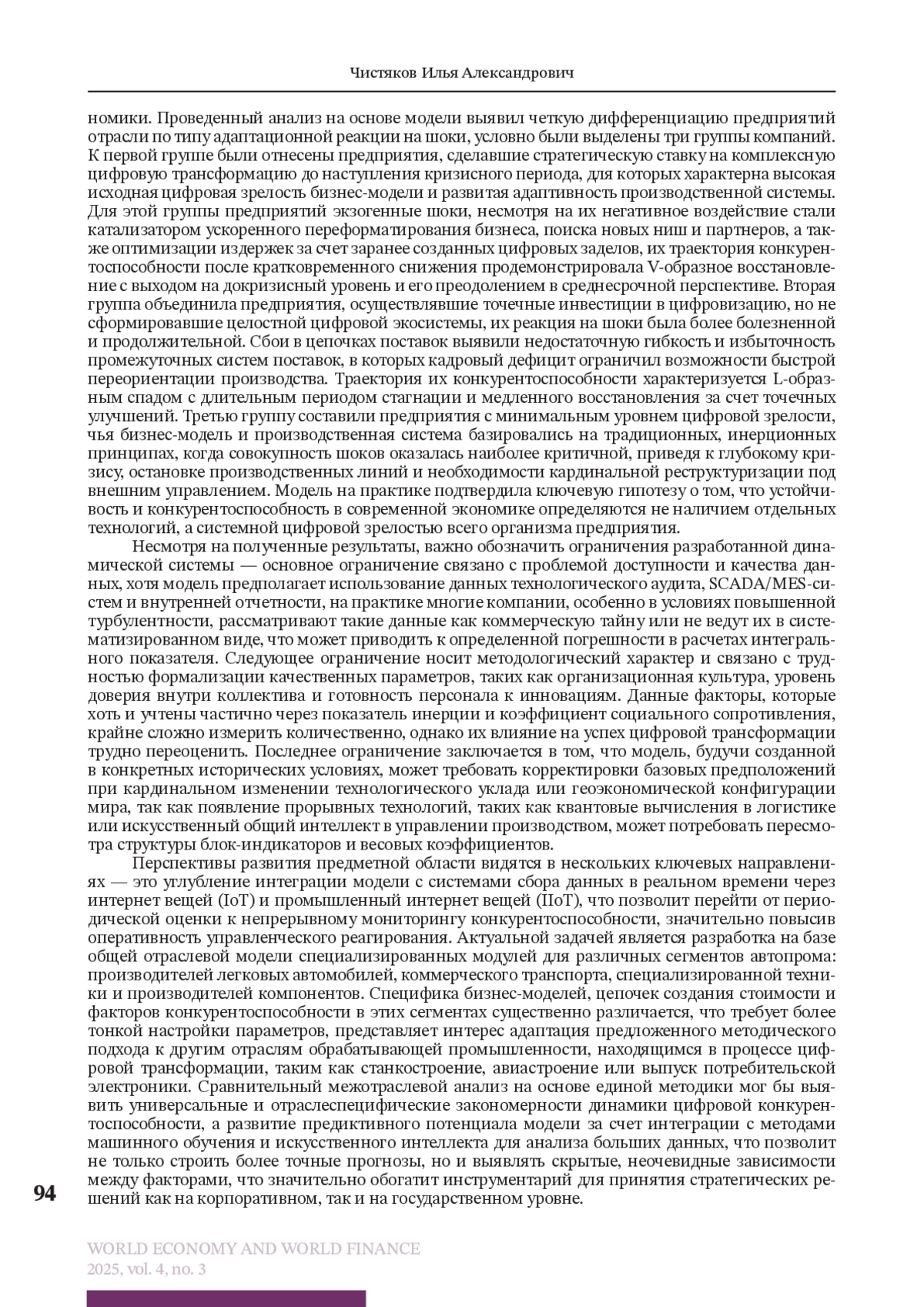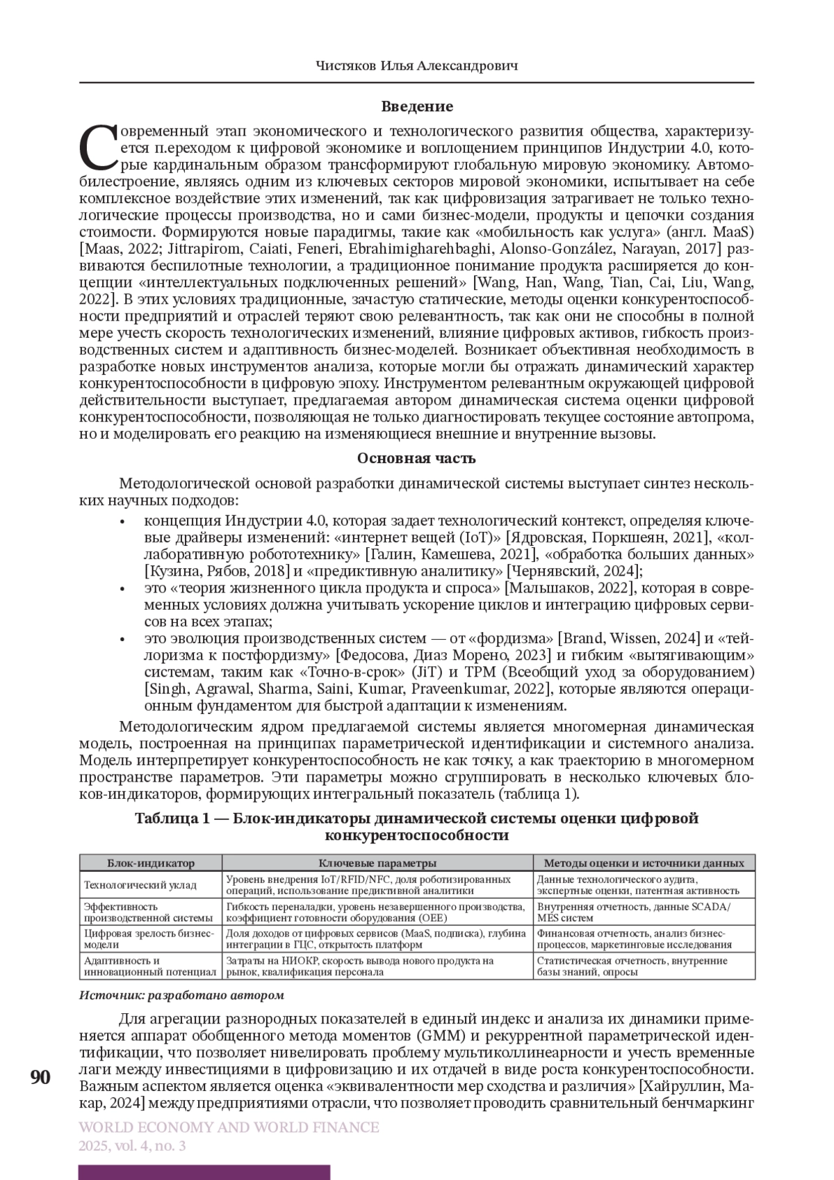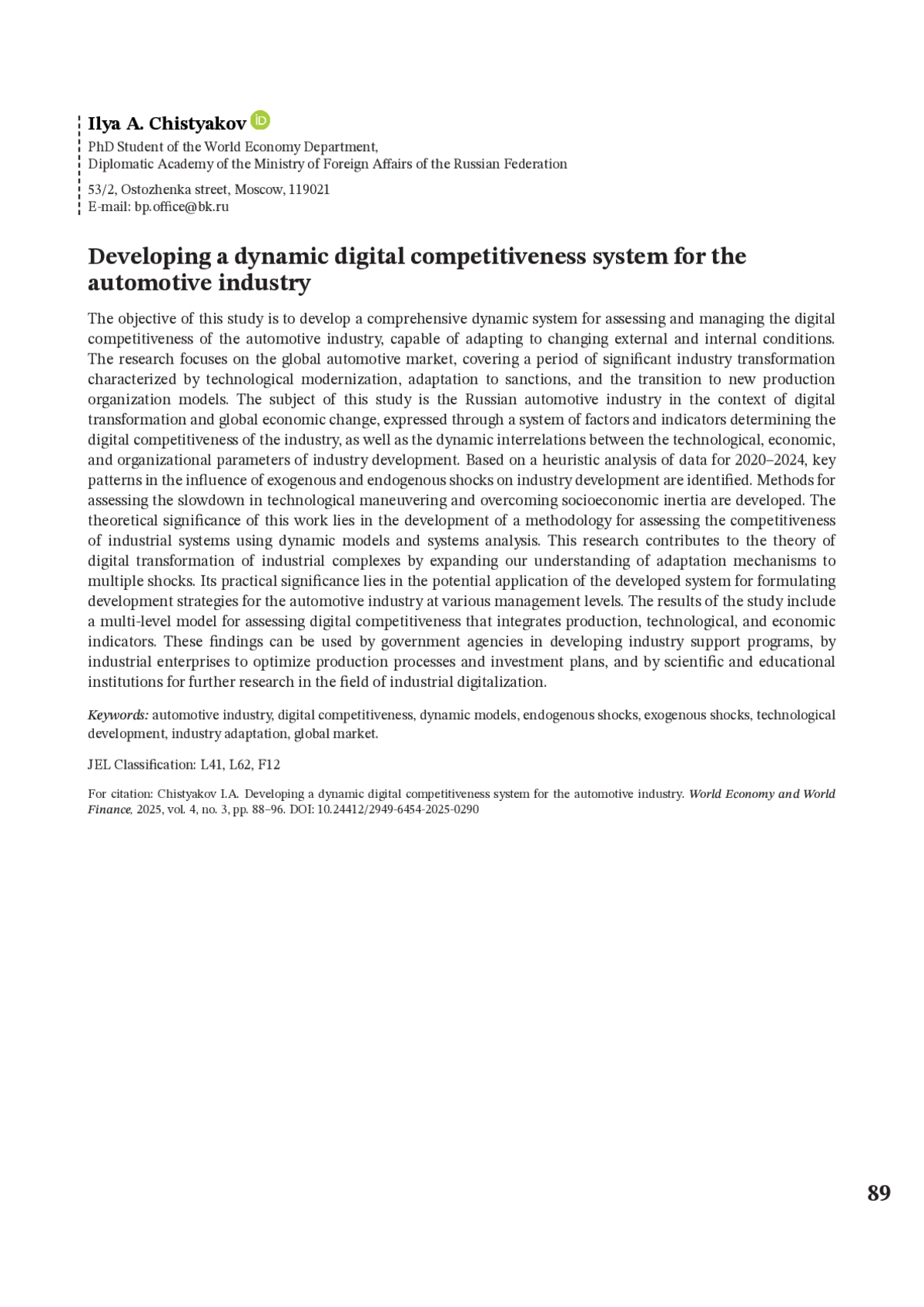 ЧИСТЯКОВ И. А. РАЗРАБОТКА ДИНАМИЧЕСКОЙ СИСТЕМЫ ЦИФРОВОЙ КОНКУРЕНТОСПОСОБНОСТИ АВТОПРОМА // МИРОВАЯ ЭКОНОМИКА И МИРОВЫЕ ФИНАНСЫ. 2025. № 3, ТОМ 4