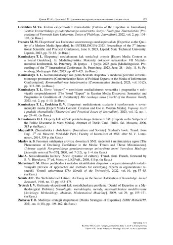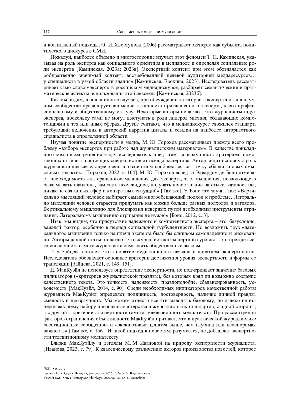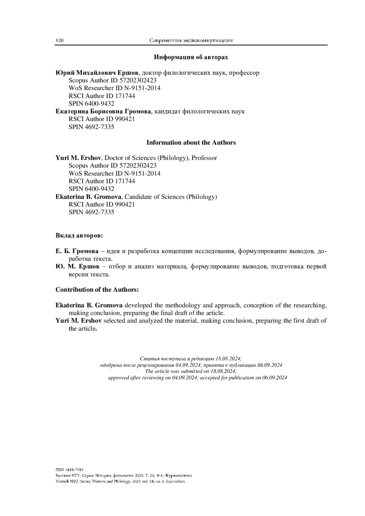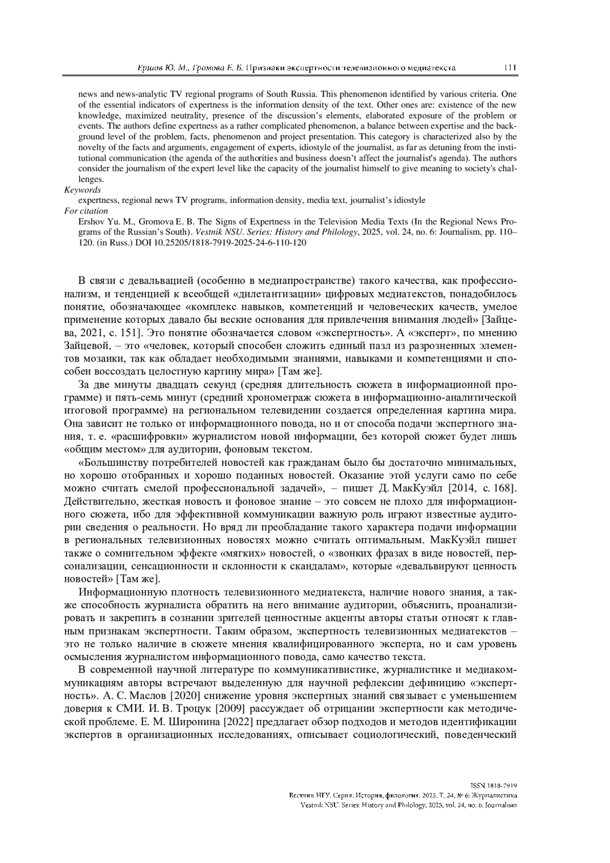ЕРШОВ Ю. М., ГРОМОВА Е. Б. ПРИЗНАКИ ЭКСПЕРТНОСТИ ТЕЛЕВИЗИОННОГО МЕДИАТЕКСТА (НА ПРИМЕРЕ РЕГИОНАЛЬНЫХ НОВОСТНЫХ ТЕЛЕВИЗИОННЫХ ПРОГРАММ ЮГА РОССИИ) // ВЕСТНИК НГУ. СЕРИЯ: ИСТОРИЯ, ФИЛОЛОГИЯ. 2025. ТОМ 24, № 6