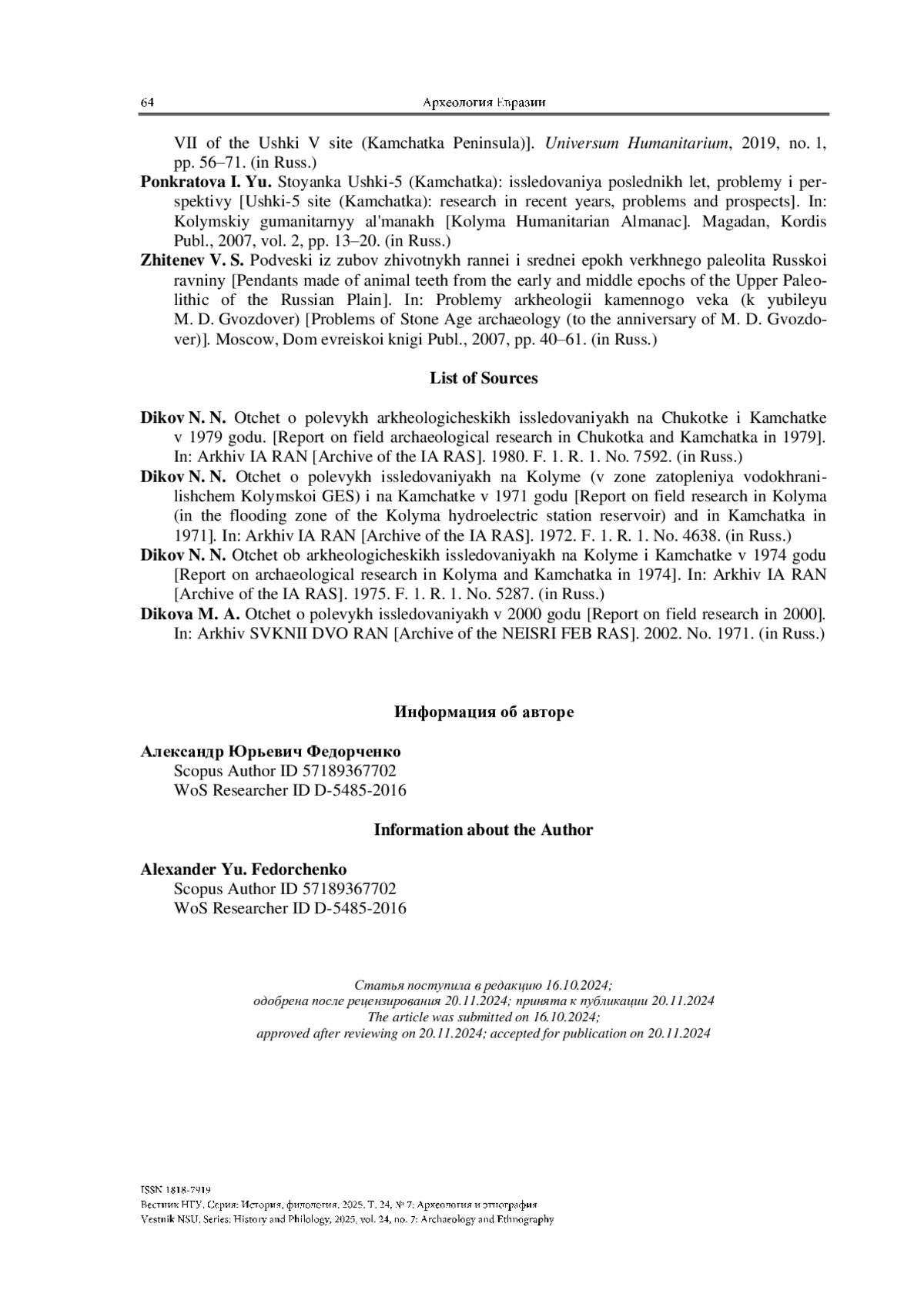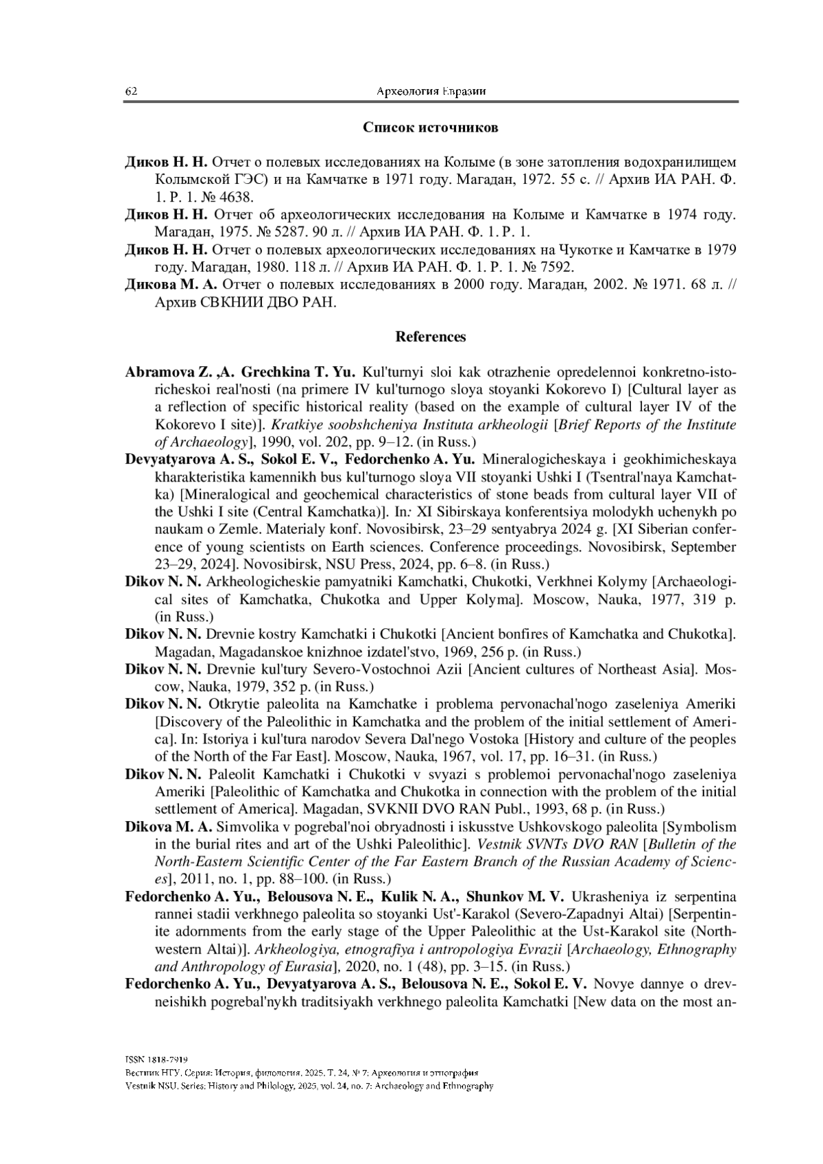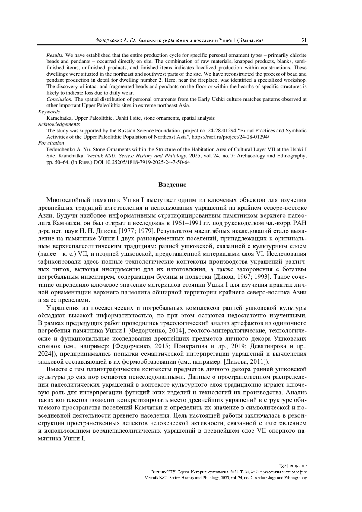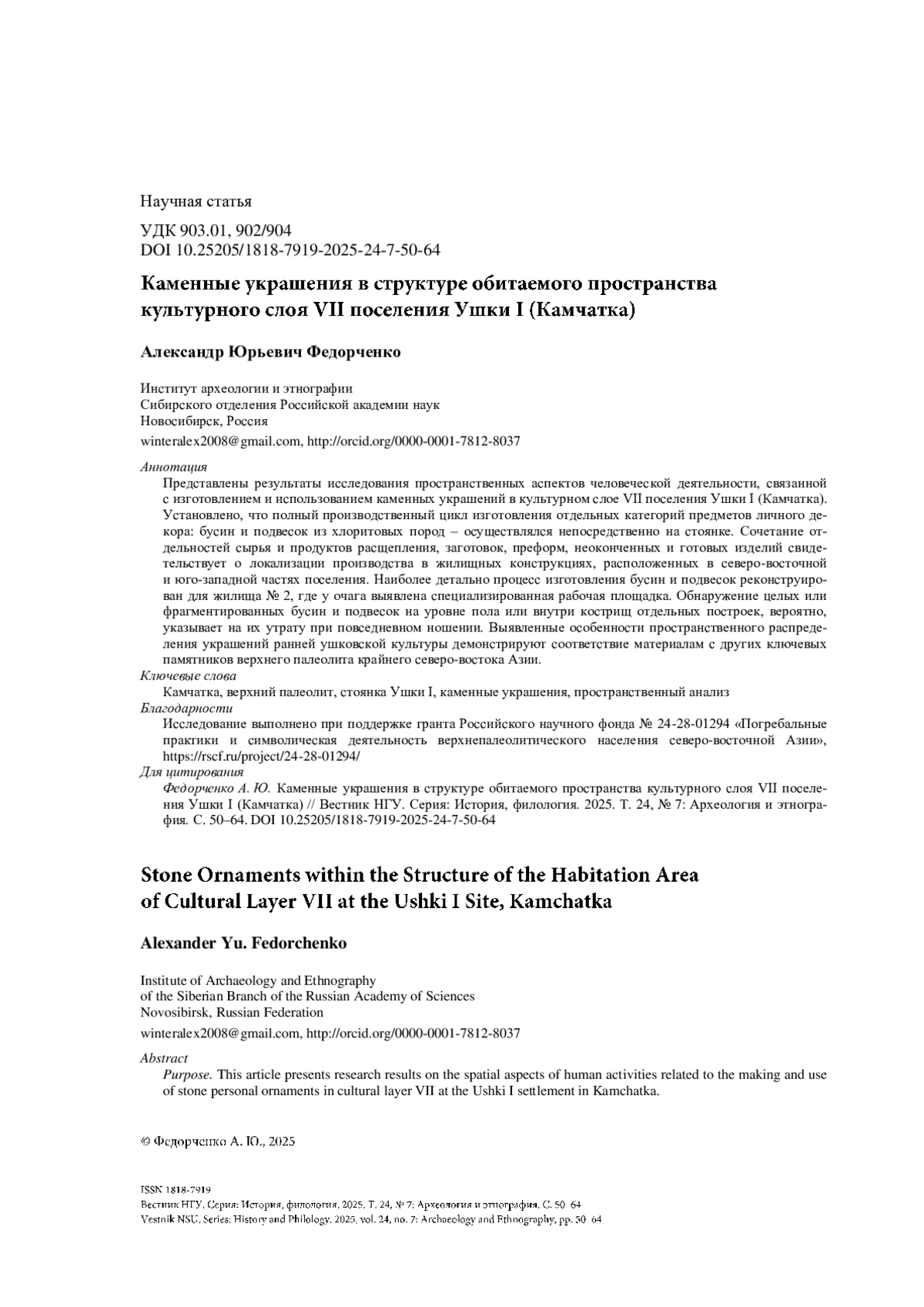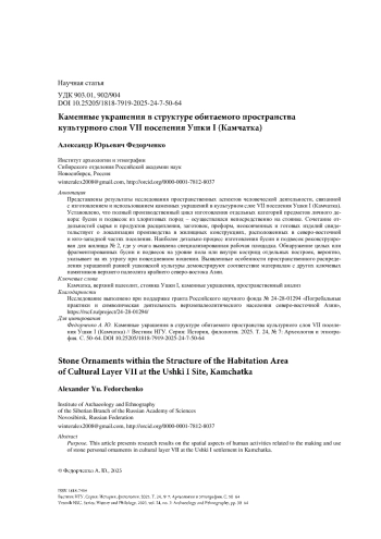 ФЕДОРЧЕНКО А. Ю. КАМЕННЫЕ УКРАШЕНИЯ В СТРУКТУРЕ ОБИТАЕМОГО ПРОСТРАНСТВА КУЛЬТУРНОГО СЛОЯ VII ПОСЕЛЕНИЯ УШКИ I (КАМЧАТКА) // ВЕСТНИК НГУ. СЕРИЯ: ИСТОРИЯ, ФИЛОЛОГИЯ. 2025. ТОМ 24, № 7