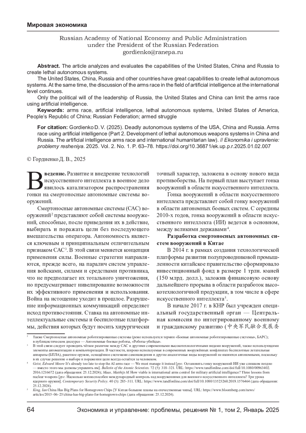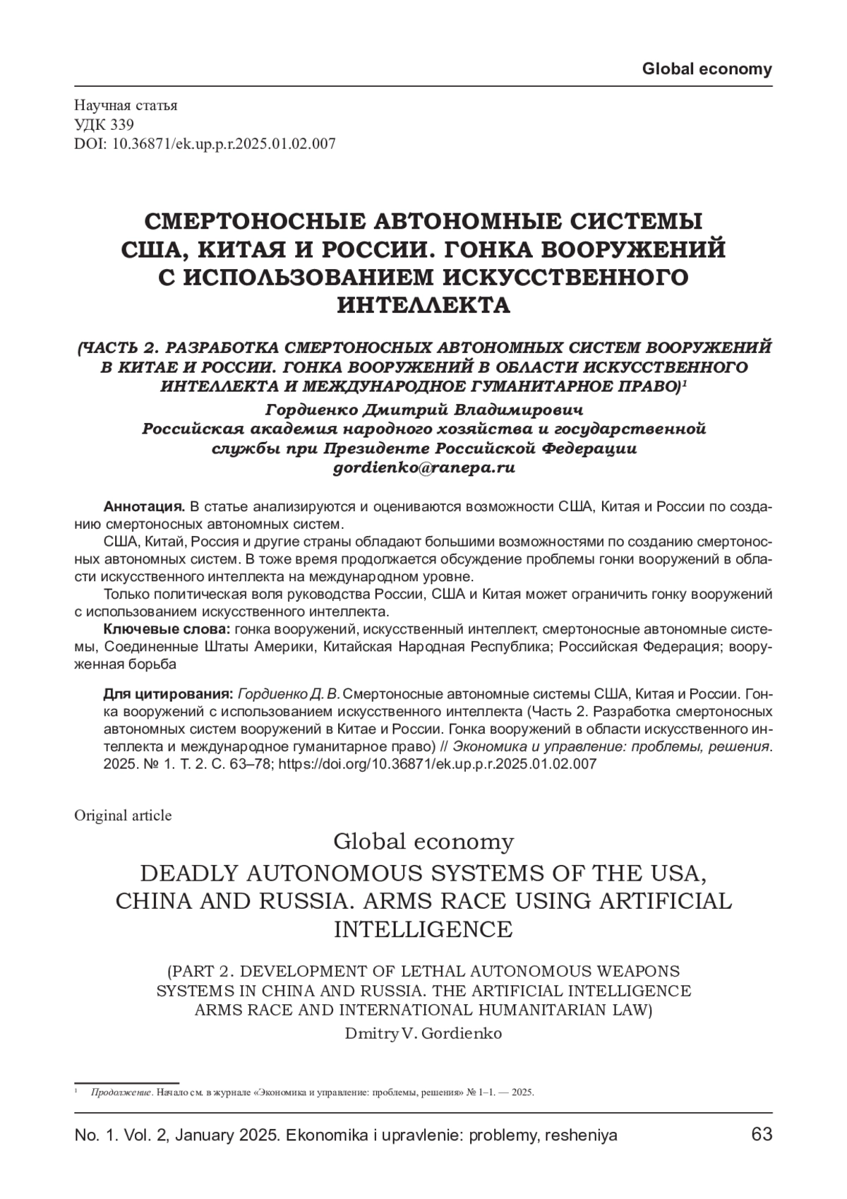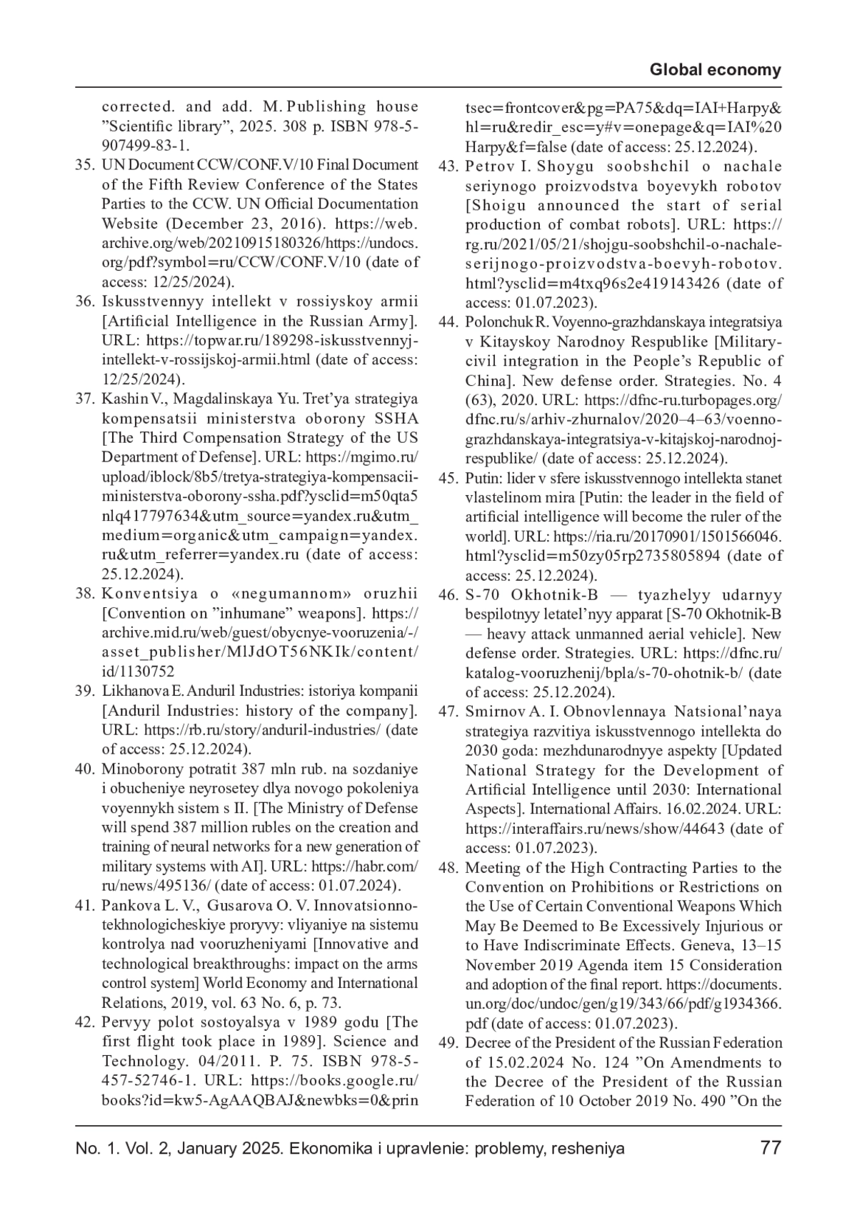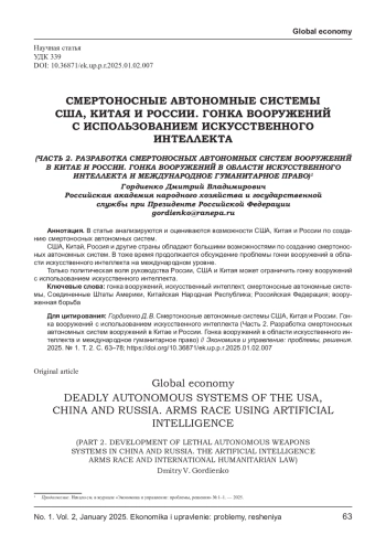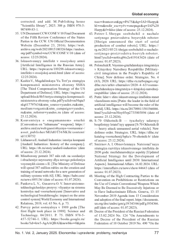 41. Панкова Л. В., Гусарова О. В. Иновационно- технологические прорывы: влияние на систему контроля над вооружениями // Мировая экономика и международные отношения, 2019, том 63 № 6, с. 73. EDN: CULGBO