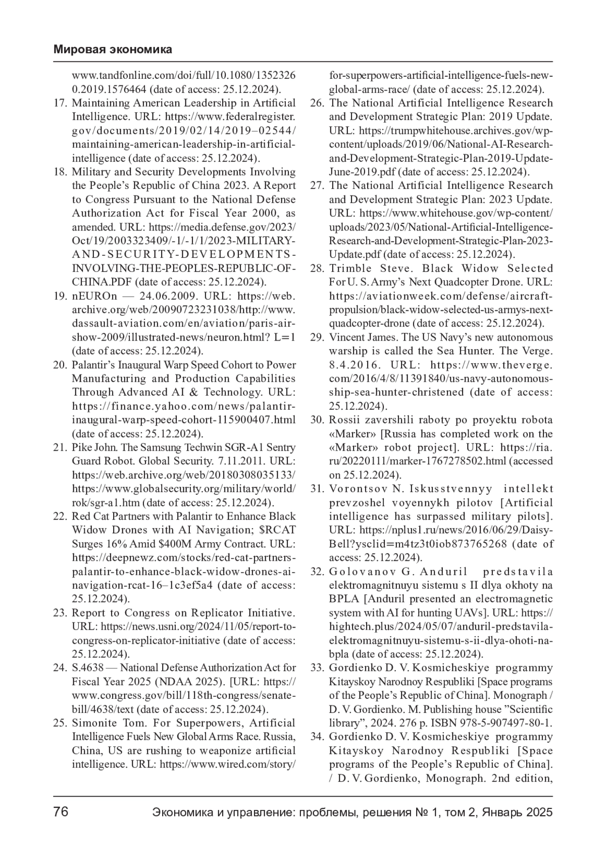 32. Голованов Г. Anduril представила электромагнитную систему с ИИ для охоты на БПЛА. URL: https://hightech.plus/2024/05/07/anduril-predstavila-elektromagnitnuyu- sistemu-s-ii-dlyaohoti-na-bpla (дата обращения: 25.12.2024).